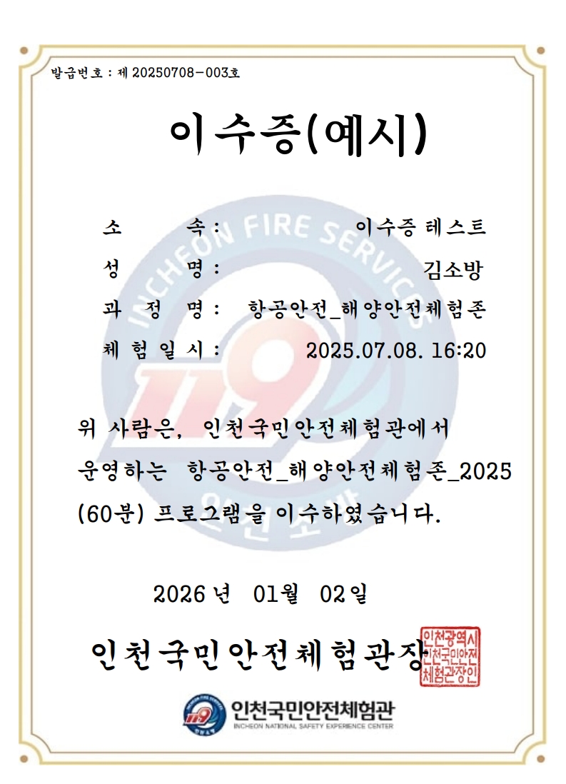 - 이수증 신청시 예약자 명을 변경하시면 체험 수료처리 확인이 어려우니 변경하시면 안됩니다.