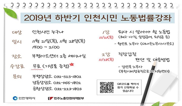 『2019년 하반기 인천시민 노동법률 무료강좌』안내