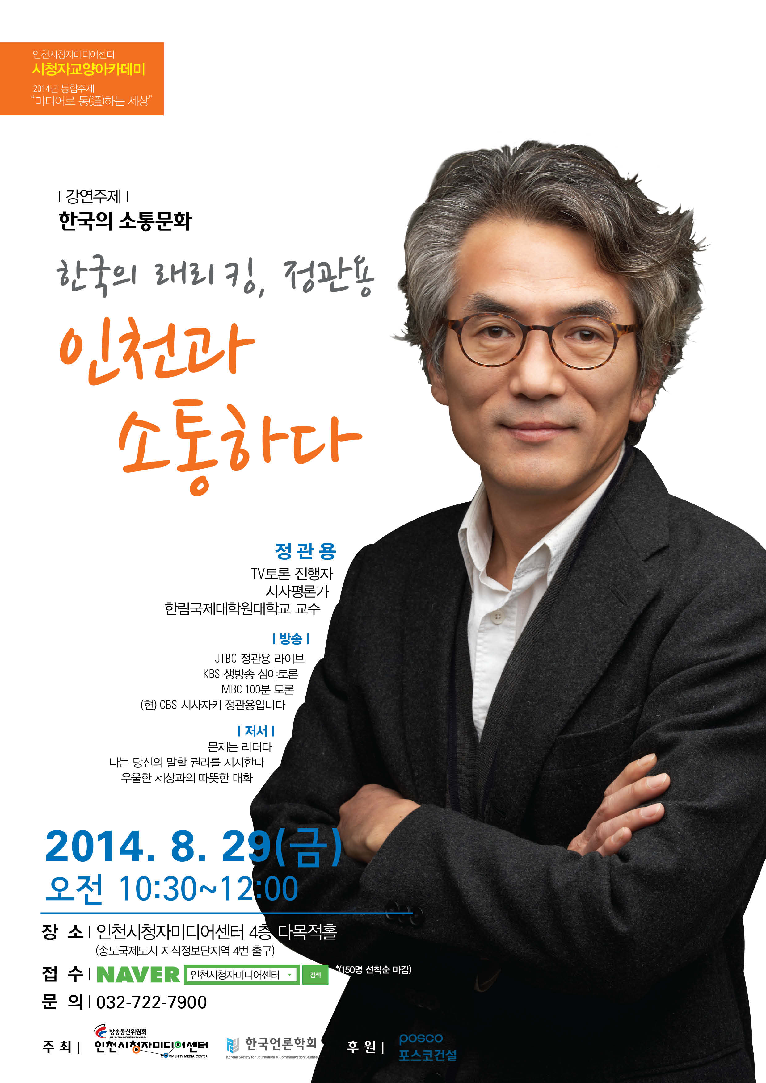한국방송통신전파진흥원에서는 시청자를 대상으로 일상생활에 필요한 미디어 관련 지식을 저명인사의 공개 강연형식을 통해 전달하는 ‘시청자 교양 아카데미’ 프로그램을 운영합니다. 2014년 통합강연주제인 ‘미디어로 통(通)하는 세상’의 첫 강연이 8월 29일(금)에 개최됨을 알려드립니다.
