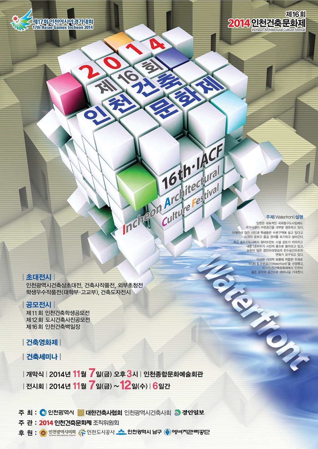 인천의 항구 도시적 특성인 대규모 수변공간에 대한 시민과 학생들의 재해석을 통해 젊은 감각의 새로운 공간으로 다시 태어나길 바라며, “수(水) & 수변공간(Waterfront)”이라는 주제로 『2014 인천건축문화제』를 개최하오니 많은 관심과 참여 부탁드립니다.