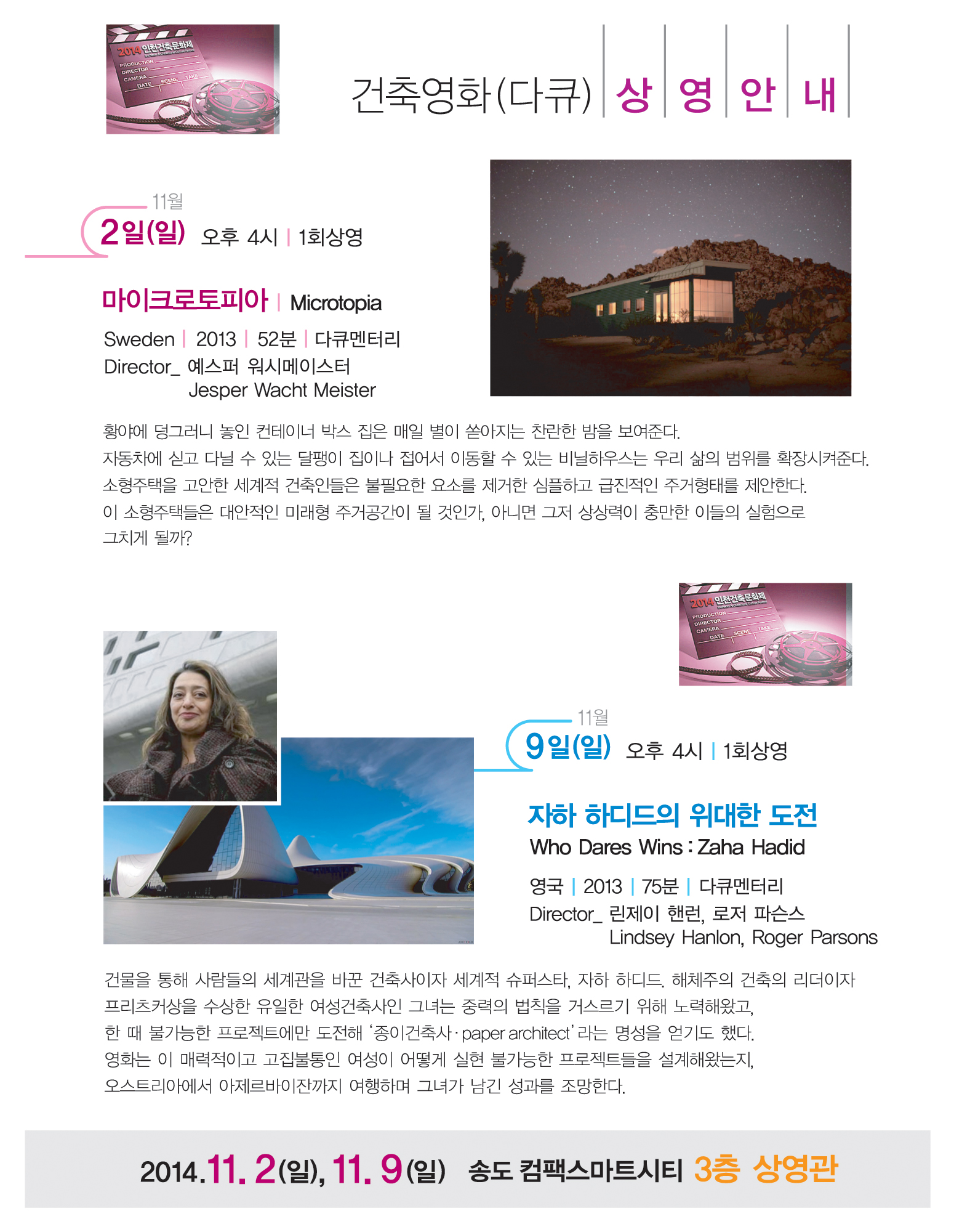 - 건축영화 상영 : 송도 컴팩트스마트시티 3층 상영관 [2014.11. 2.(일), 11. 9.(일) 16:00~]