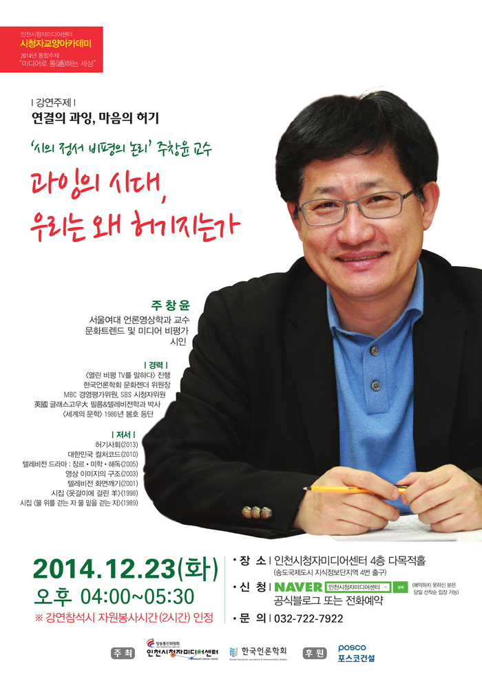2014년 통합강연주제인 ‘미디어로 통(通)하는 세상’의 마지막 강연인 이번 강연은 ‘허기사회’, ‘대한민국 컬처코드’의 저자이자 문화트렌드 및 미디어 비평가인 서울여대 언론영상학과 주창윤 교수를 초청해 ‘연결의 과잉, 마음의 허기’라는 주제로 12월 23일(화)에 개최됩니다.