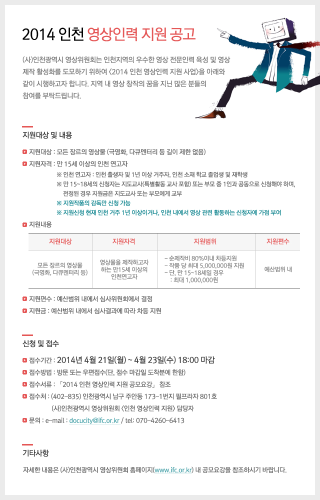 2014 인천영상인력지원사업 공모요강2014 인천영상인력지원사업 지원신청서인천광역시 영상위원회에서는