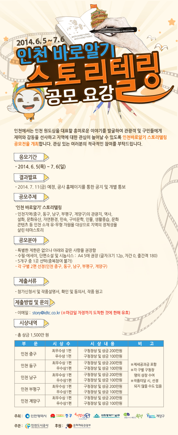 인천에서는 인천 원도심을 대표할 흥미로운 이야기를 발굴하여 관광객 및 구민들에게 재미와 감동을 선사하고 지역에 대한 관심이 늘어날 수 있도록 인천바로알기 스토리텔링 공모전을 개최합니다. 관심 있는 여러분의 적극적인 참여를 부탁드립니다.