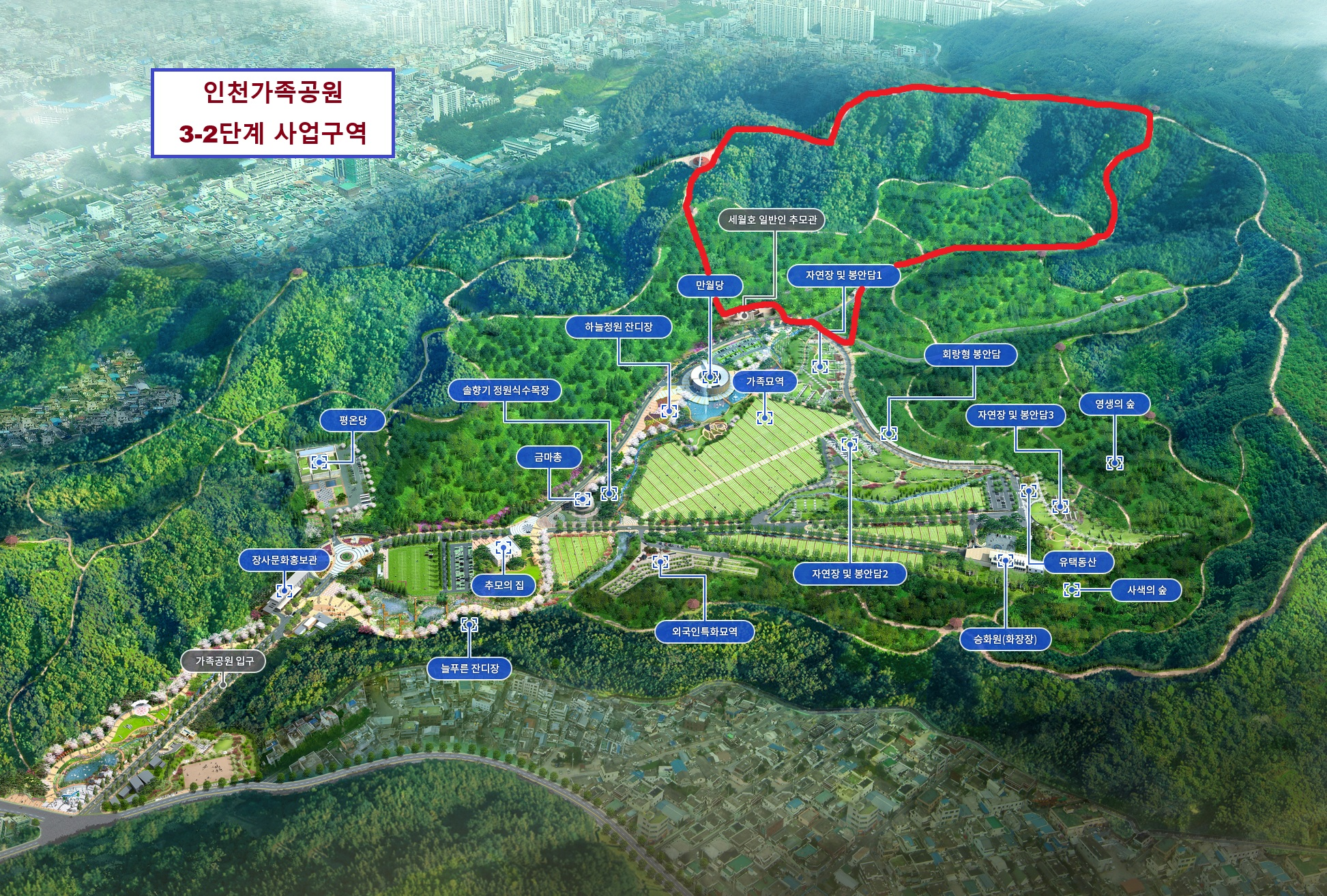 인천가족공원을 자연 친화적인 공원 조성 및 묘지난 해소를 위해 단계별 추진계획에 따라 3-2단계 시행중입니다.