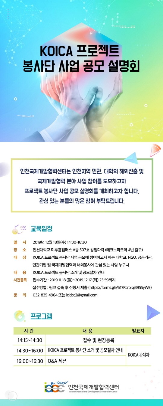 인천국제개발협력센터에서 인천지역 민관, 대학의 해외진출 및 국제개발협력 분야 사업 참여를 도모하고자 KOICA프로젝트 봉사단 사업 공모 설명회를 개최하오니 관심 있는 분들의 많은 참여 부탁드립니다.