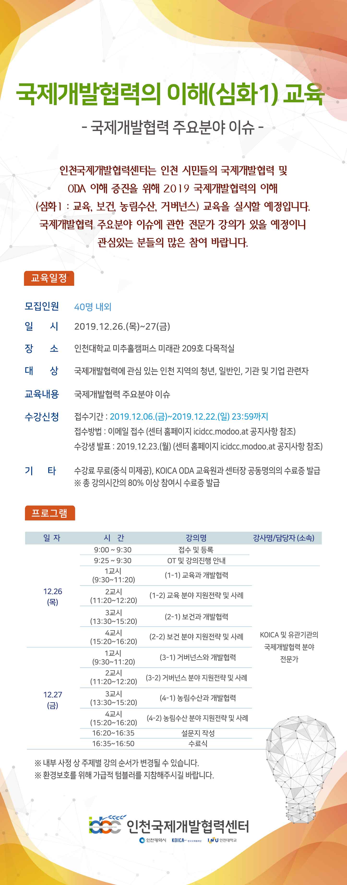 인천국제개발협력센터 정기교육 안내 : 국제개발협력의 이해(심화1:교육, 보건, 농림수산, 거버넌스) 과정