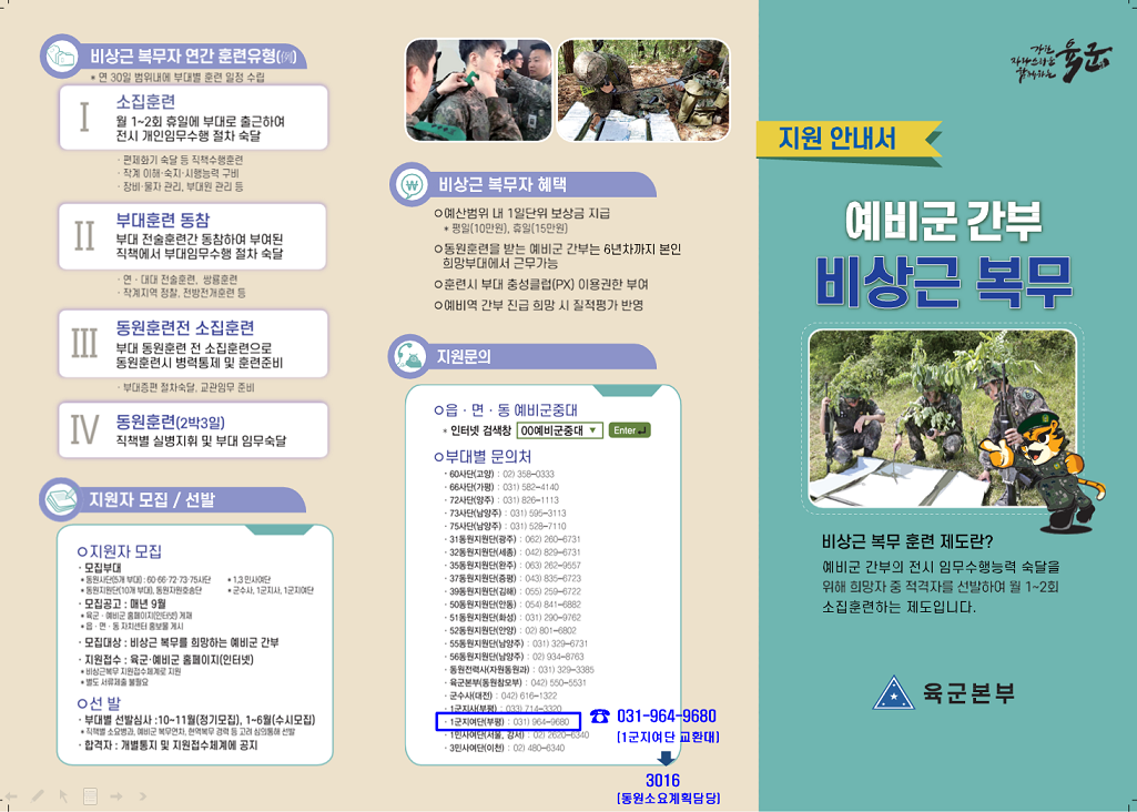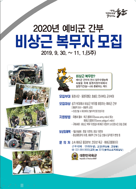 - 모집URL:육군 홈페이지(www.army.mil.kr), 예비군 홈페이지(www.yebigun1.mil.kr)