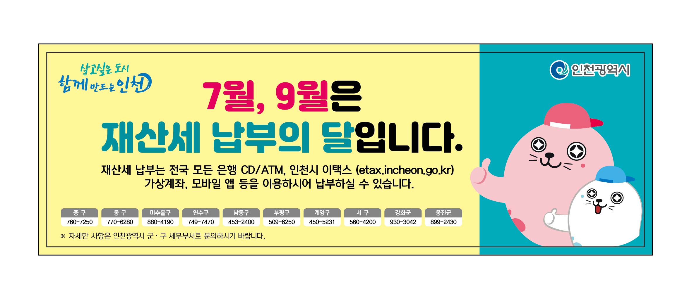 - (인터넷납부) 인천이택스(etax.incheon.go.kr), 위택스(www.wetax.go.kr) 등