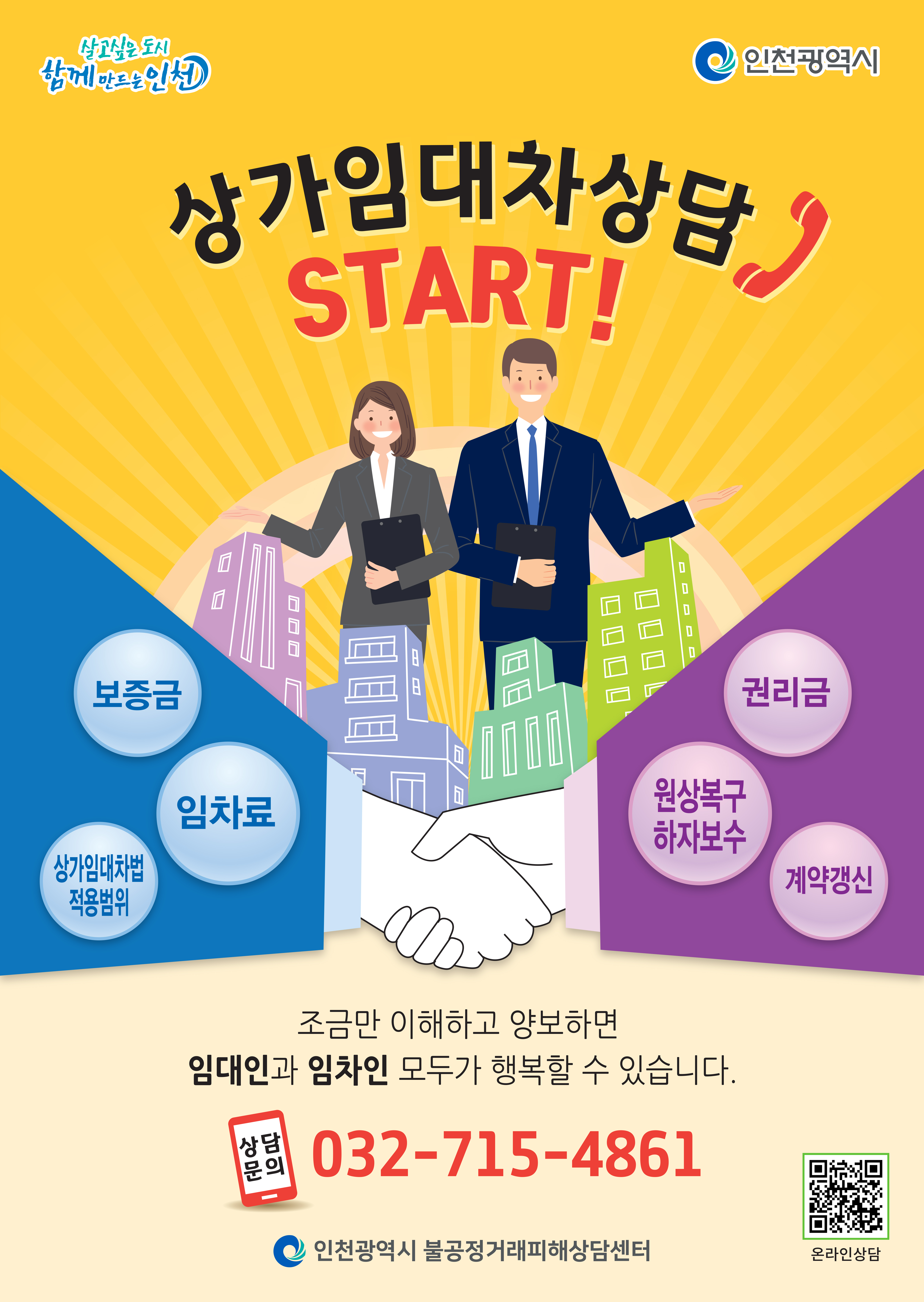 자세한 사항은 인천소상공인서민금융복지지원센터 홈페이지(http://www.insupport.or.kr/) 및 인천불공정거래피해상담지원팀(032-715-7294~5)로 문의하시기 바랍니다. 상가임대차 상담 대표전화는 032–715–4861이며, 상담시간은 오전 10시부터 오후 5시까지(점심시간 12시~1시)입니다.