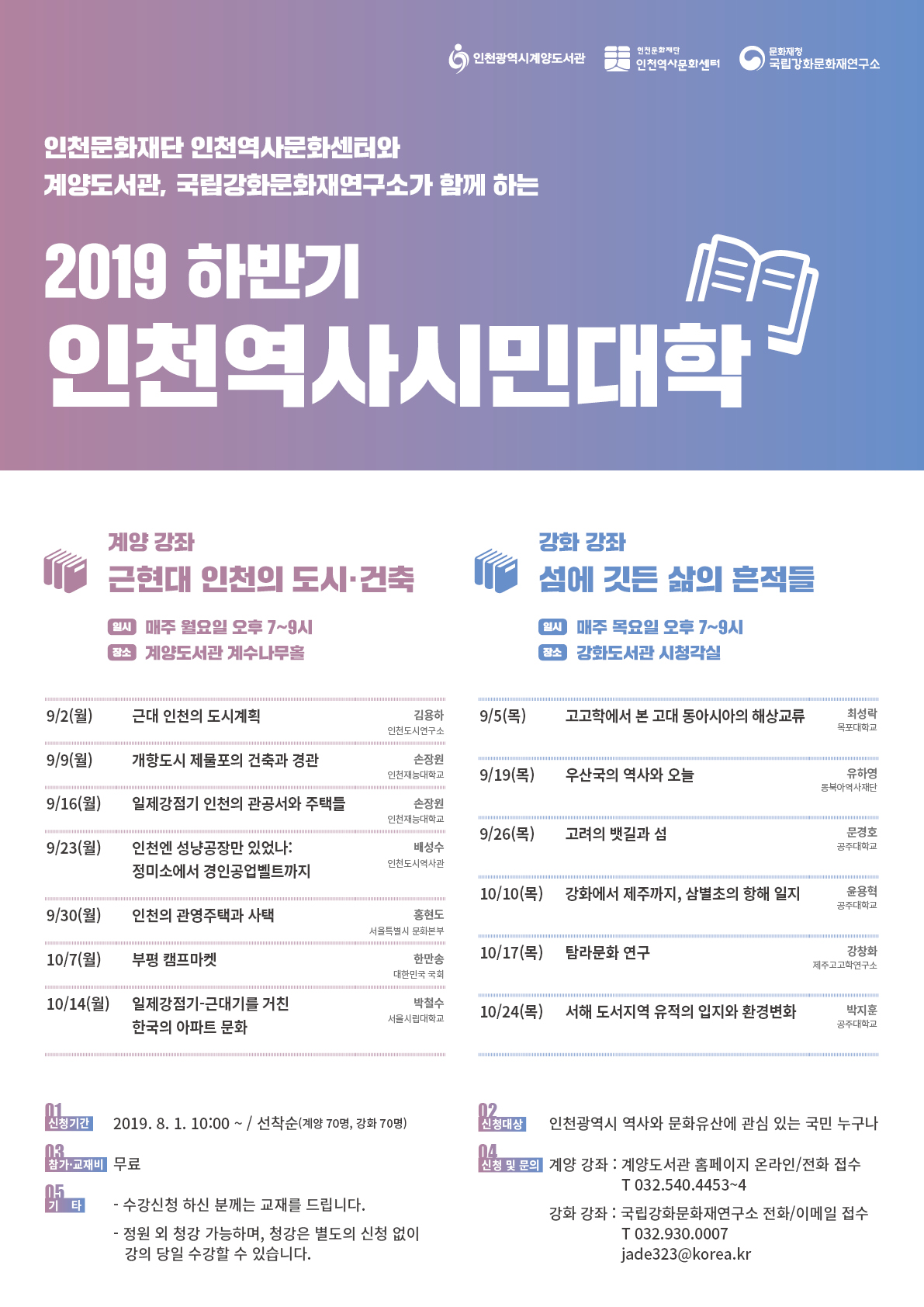 인처의 역사와 문화유산에 관심 있는 누구나 "2019년 하반기 인천역사시민대학" 을 운영하오니 많은 관심과 참여 부탁드립니다.