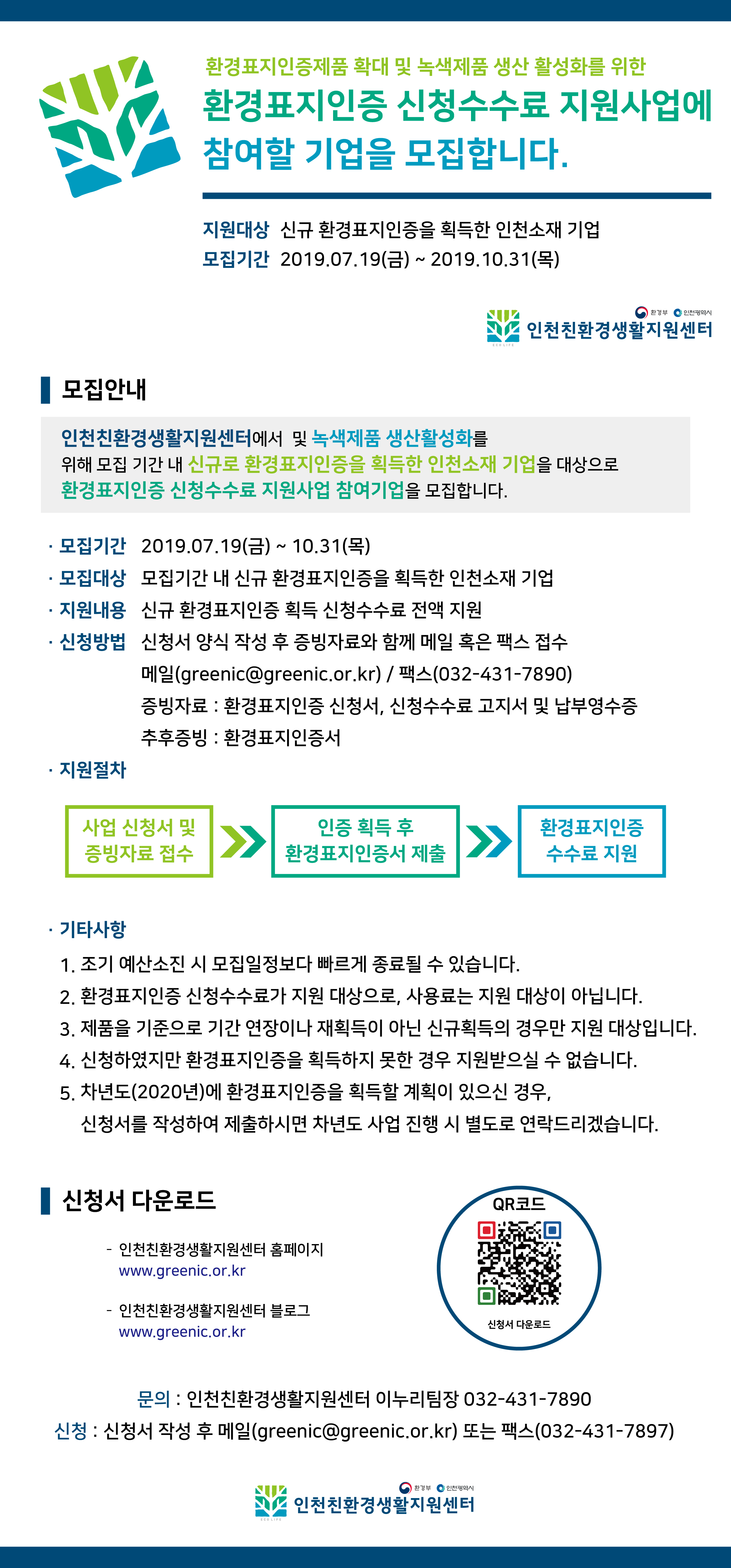 녹색제품 생산활성화를 위해 신규로 환경표지인증을 획득한 인천소재 기업을 대상으로 환경표지인증 신청수수료 지원사업 참여기업을 모집하오니 많은 신청바랍니다.