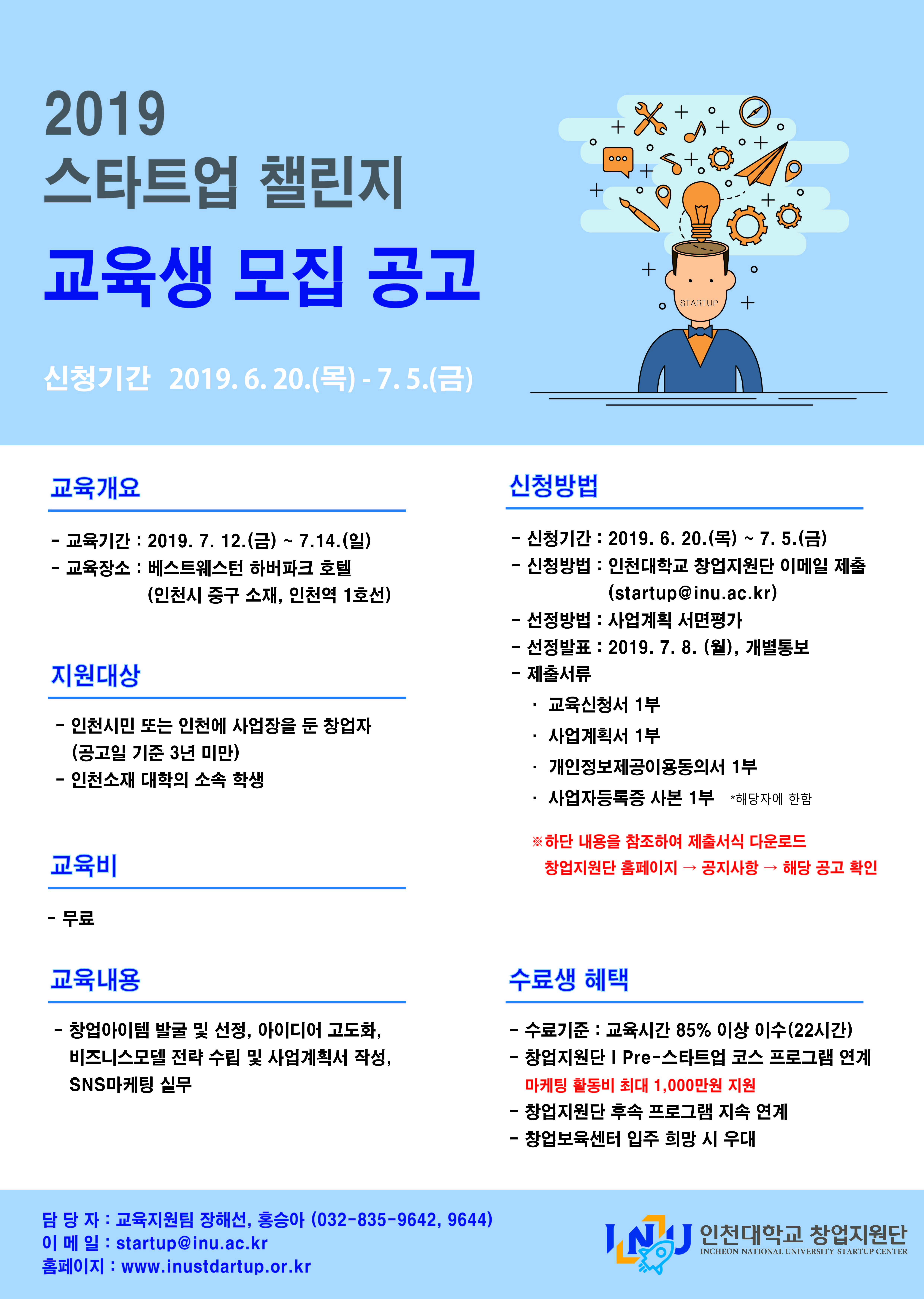 2019 INU 스타트업 챌린지 교육모집 공고문 2019 INU 스타트업 챌린지 교육 포스터 교육 신청서 및 제출서류 양식
