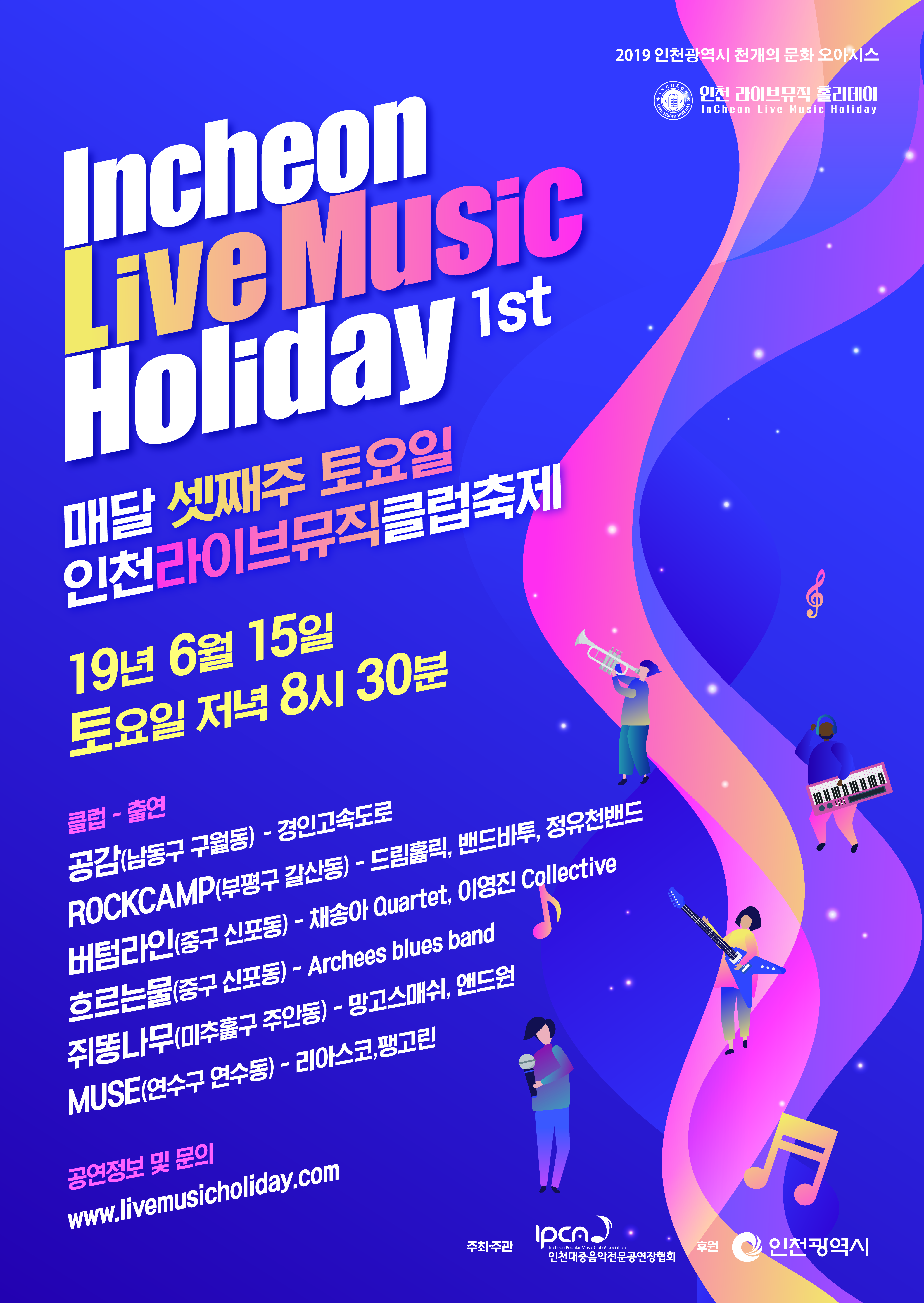 작은 생활문화공간 지원사업 "천개의 문화오아시스" 기획 사업으로 매월 셋째주 토요일 저녁 8시반에 인천의 유서깊은 라이브공연장 6곳에서 라이브 음악에 홀리는 날 “Live Music Holiday”를 개최하오니 가족과 연인과 함께 많은 관람 바랍니다.