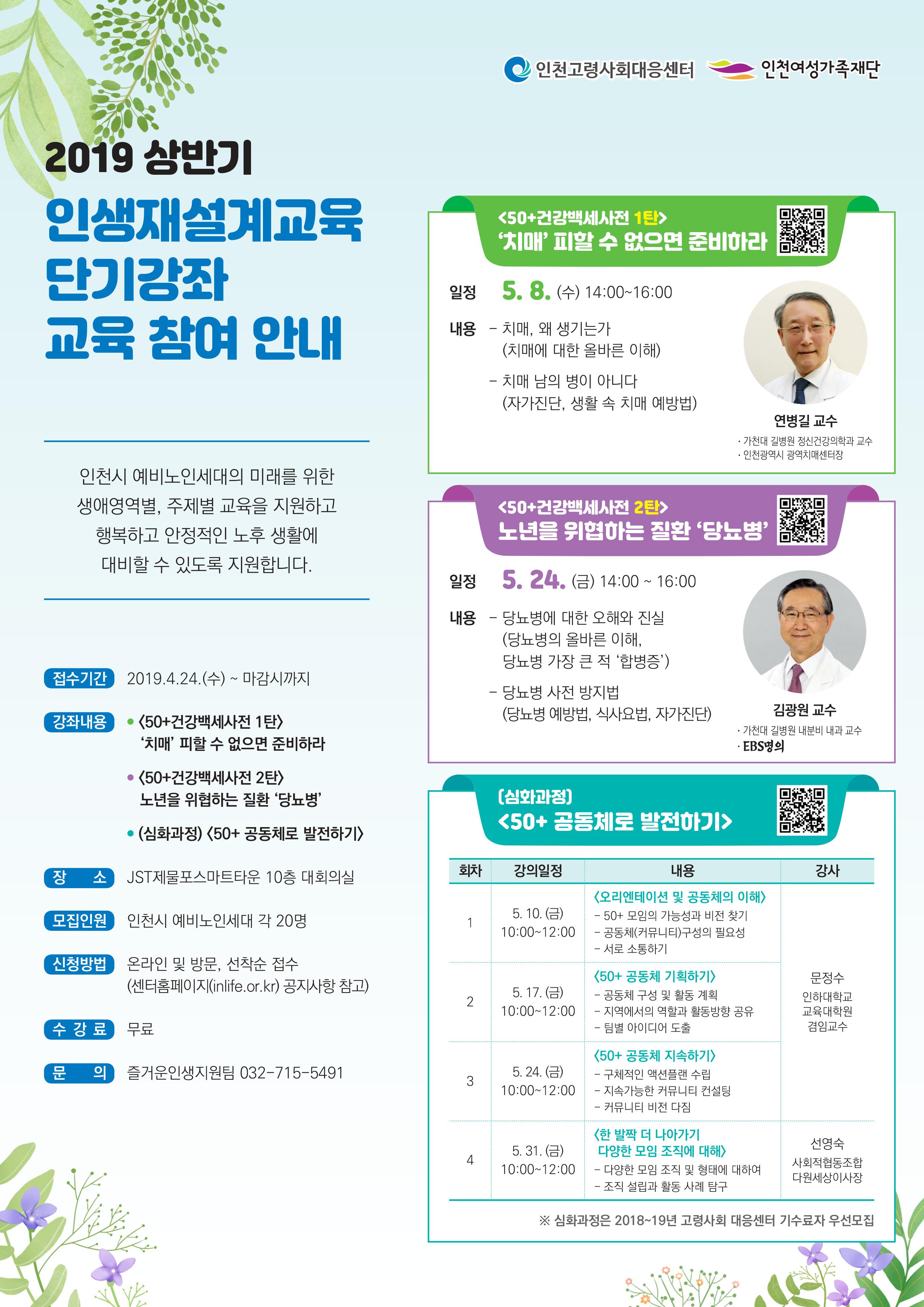 인천고령사회대응센터에서는 인천시 예비노인세대의 미래를 위한 생애영역별, 주제별 교육을 지원하고, 행복하고 안정적인 노후 생활에 대비할 수 있도록 2019 상반기 「인생재설계교육 단기강좌」를 진행하오니 많은 관심과 참여 부탁드립니다.