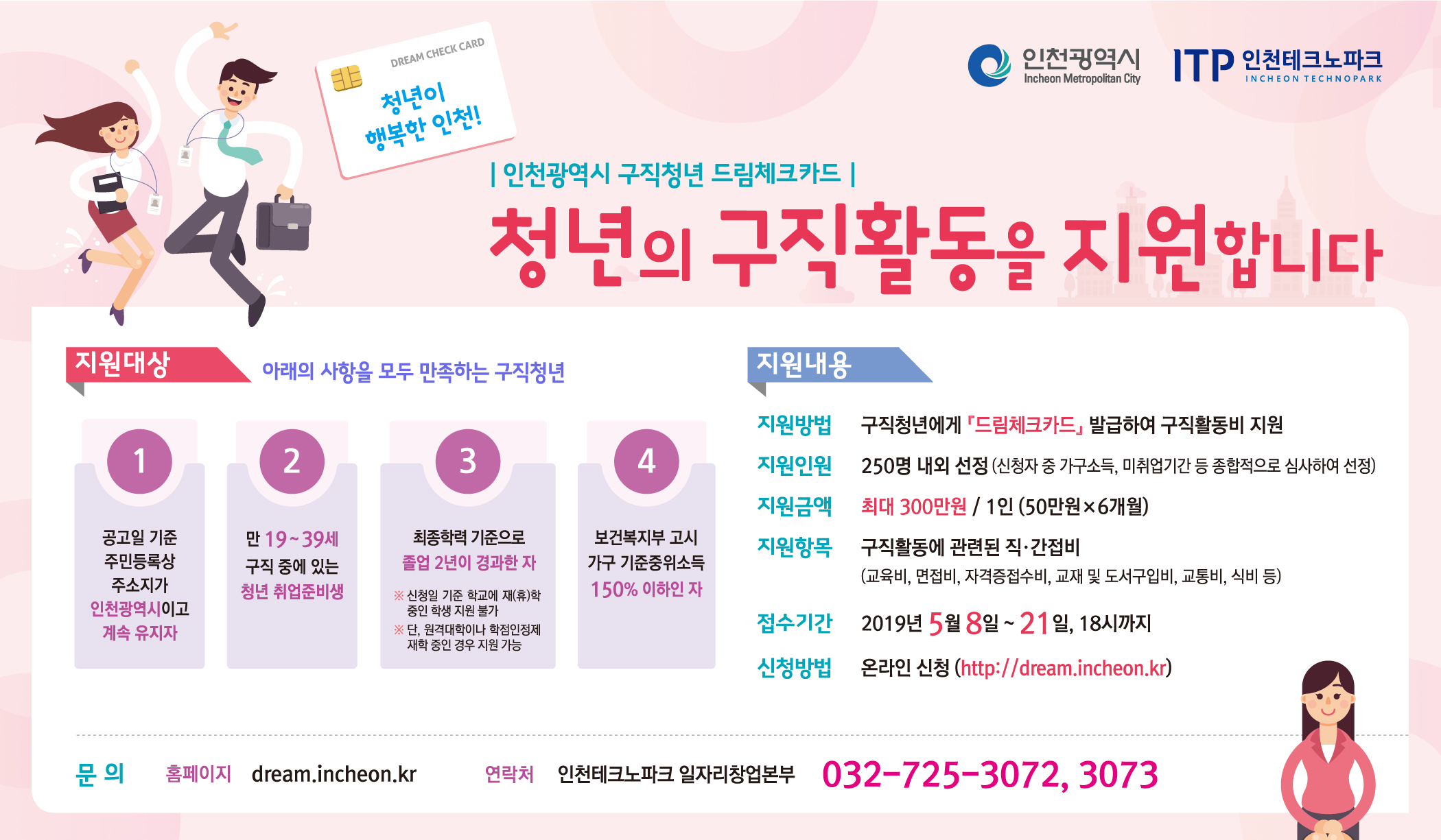 * 세부자격요건, 제출서류 등 자세한 사항은 2019.5.8일부터 온라인 접수페이지 (http://dream.incheon.kr) 및