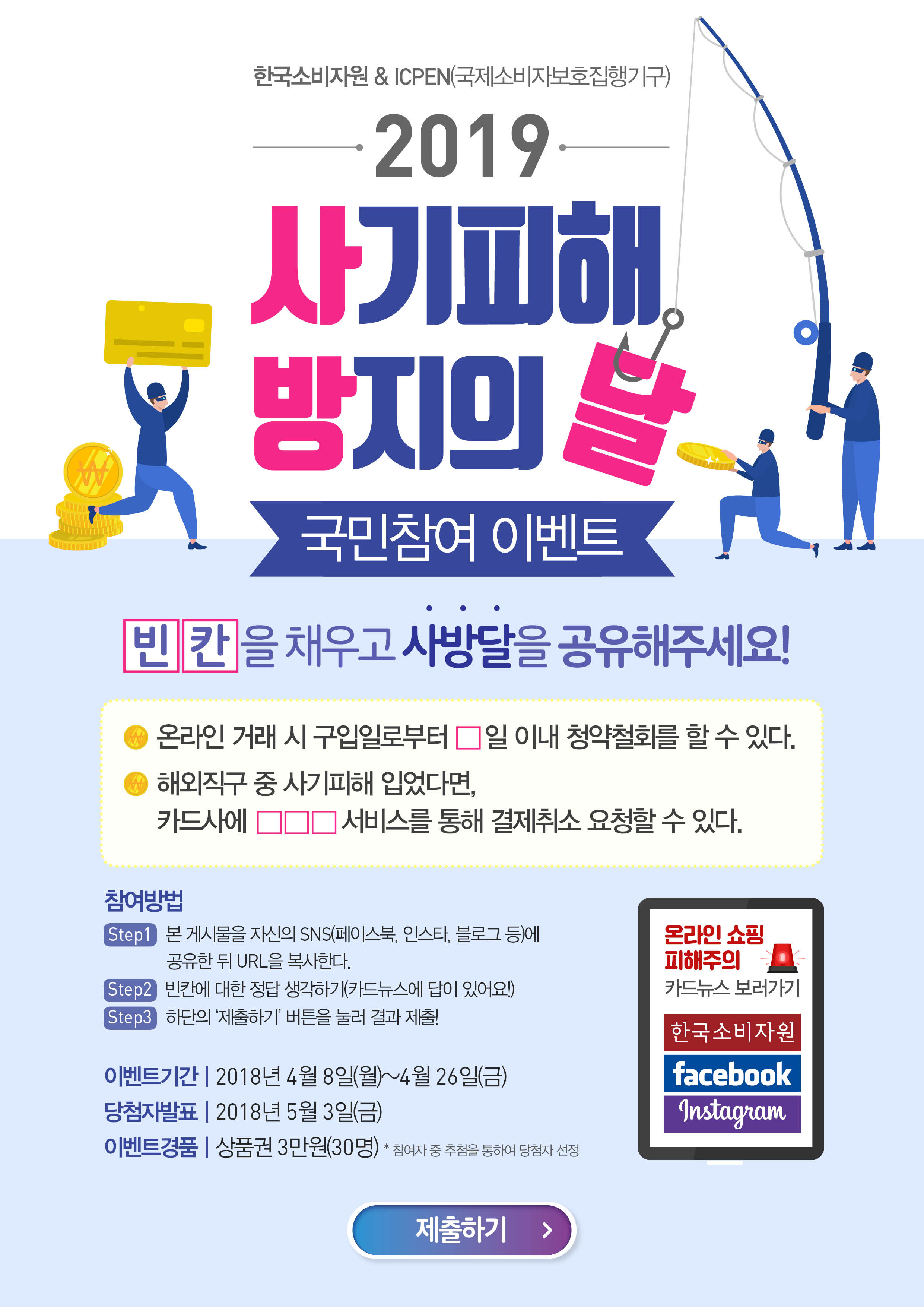 이에 전자상거래에 따른 소비자 피해의 예방을 위해 국제소비자보호집행기구(ICPEN)가 주관하는 ‘2019 사기피해방지의 달 국제 캠페인’을 진행하오니 많은 참여 부탁드립니다.