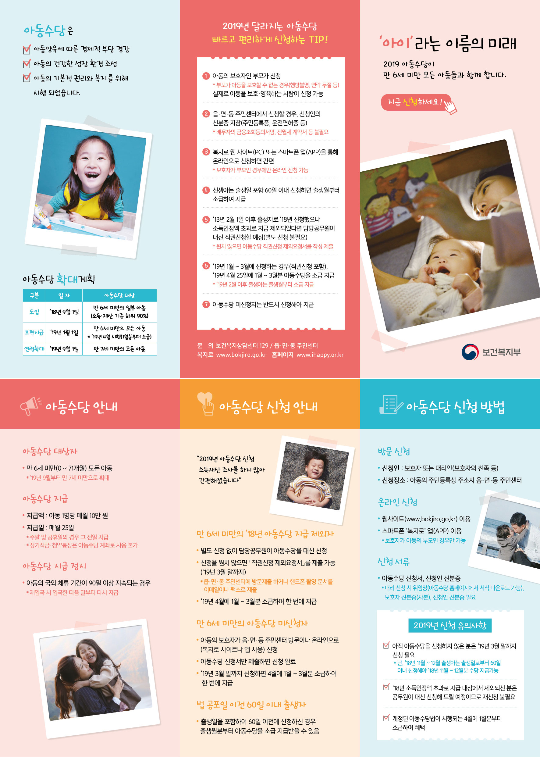 - 내용문의 : 아동수당 홈페이지(www.ihappy.or.kr), 보건복지상담센터 129, 주소지 읍면동 주민센터