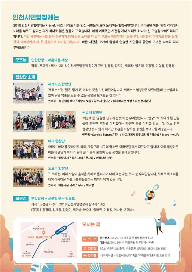인천 시민들이 모여 노래하는 합창공연인『2018년 인천시민합창제』를 개최하오니 관심있는 분들의 많은 참여 부탁드립니다.