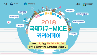 국제기구와 MICE분야 특화교육 및 취업정보 교류의 장 마련을 위해 외교부와 공동주최로 "2018 국제기구-MICE 커리어 페어"를 개최합니다.