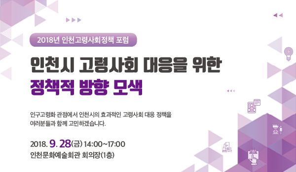 우리시 고령사회 대응을 위한 정보 및 지식 교류를 활성화하고 정책에 반영하기 위하여 전문가 및 관계자가 참여하는 '2018년 인천고령사회 정책 포럼'을 개최하오니 많은 관심과 참여 부탁드립니다.