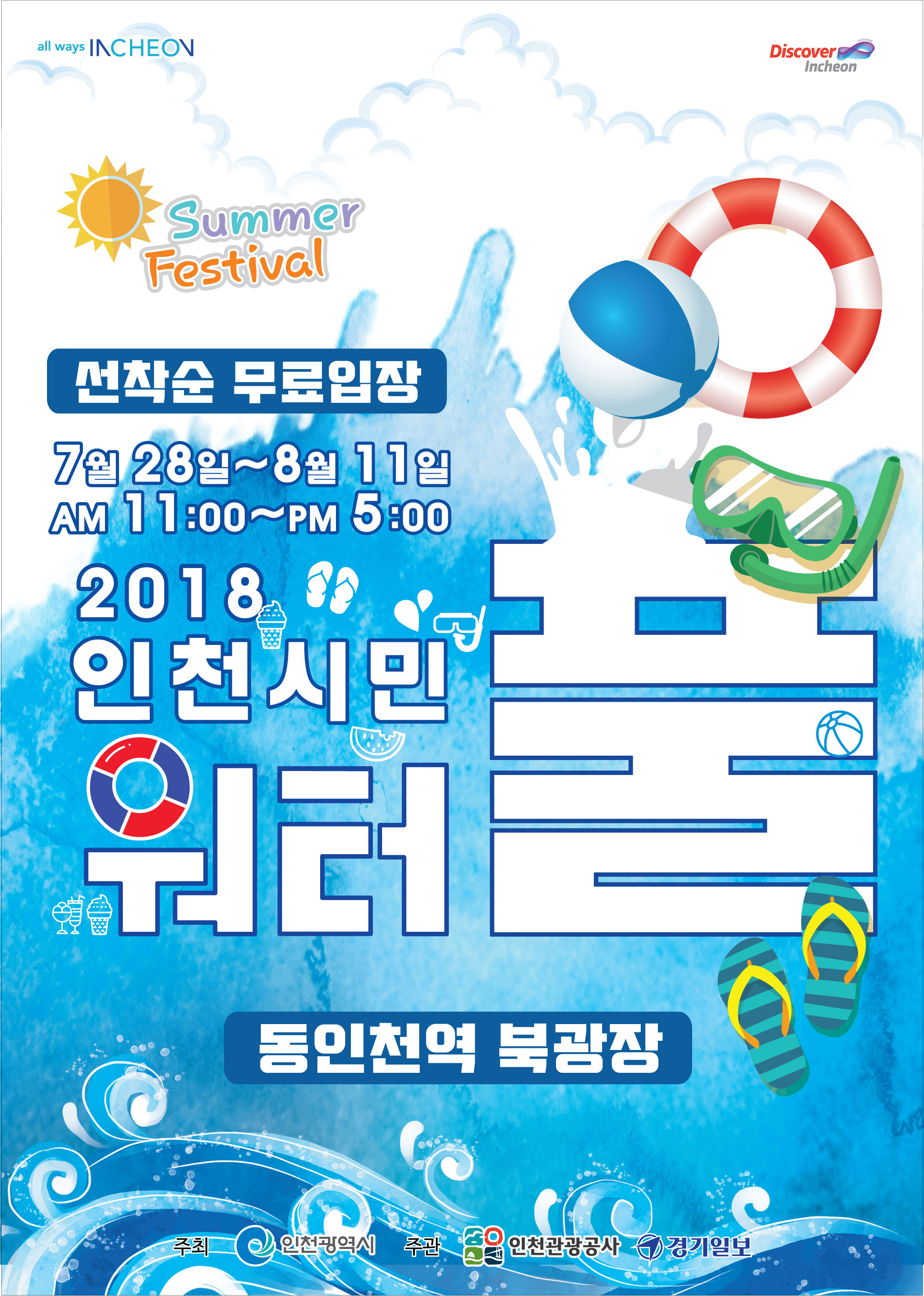 여름 휴가 시즌 시민들의 체감 행복 지수를 높이고 무더위를 식혀줄 2018 인천 시민워터풀을 아래와 같이 개장하오니 많은 시민 및 관광객들의 이용 바랍니다.