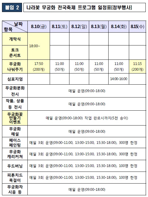 무궁화와 관련된 다양한 볼거리와 재미있는 체험 행사를 실시할 예정입니다. 시민여러분들의 적극적인 참여와 관심 바랍니다.