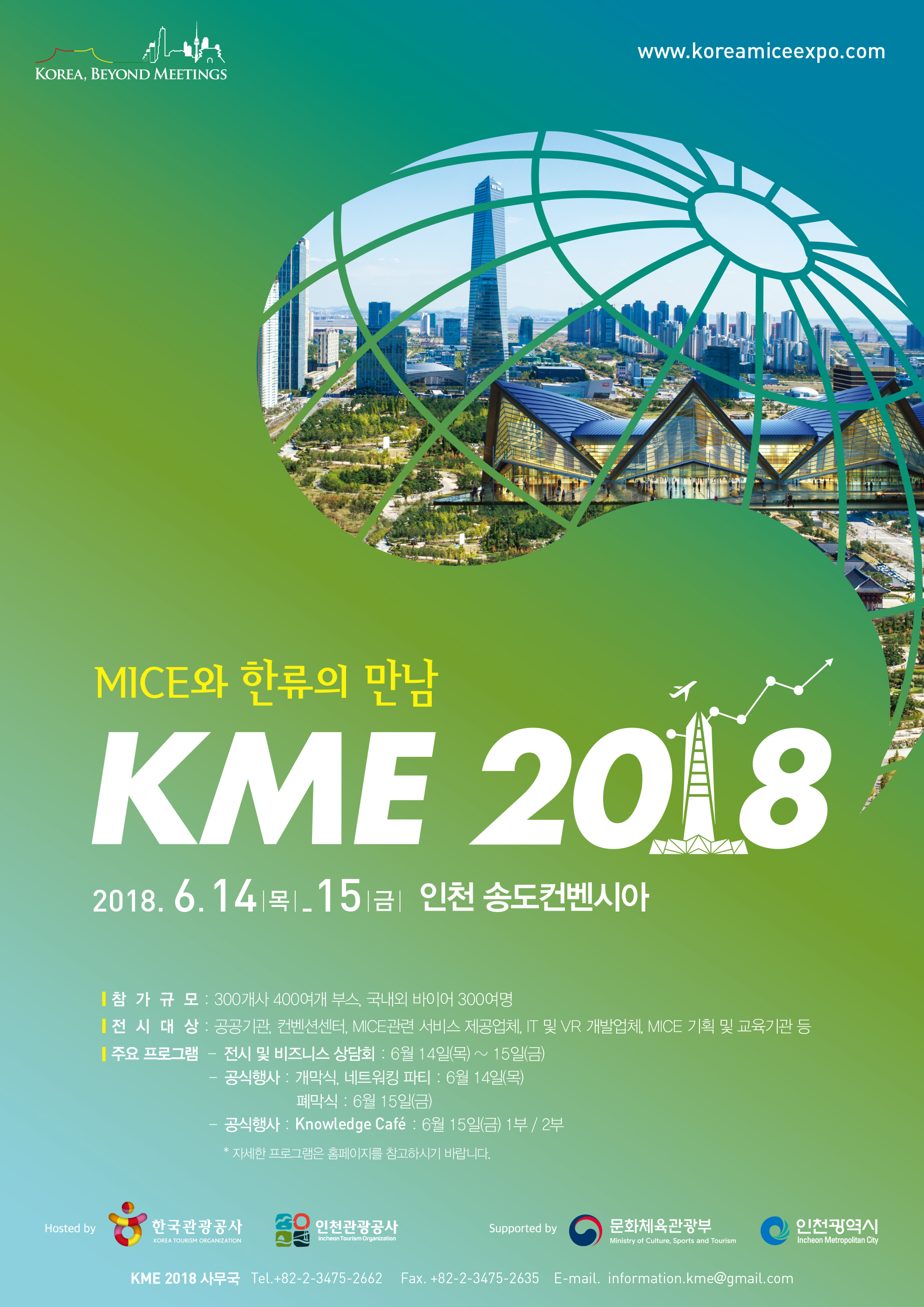 올해로 19회를 맞이한 KME 2018의 개최하오니 MICE 산업 관계자 여러분들의 많은 관심과 참여 부탁드립니다.