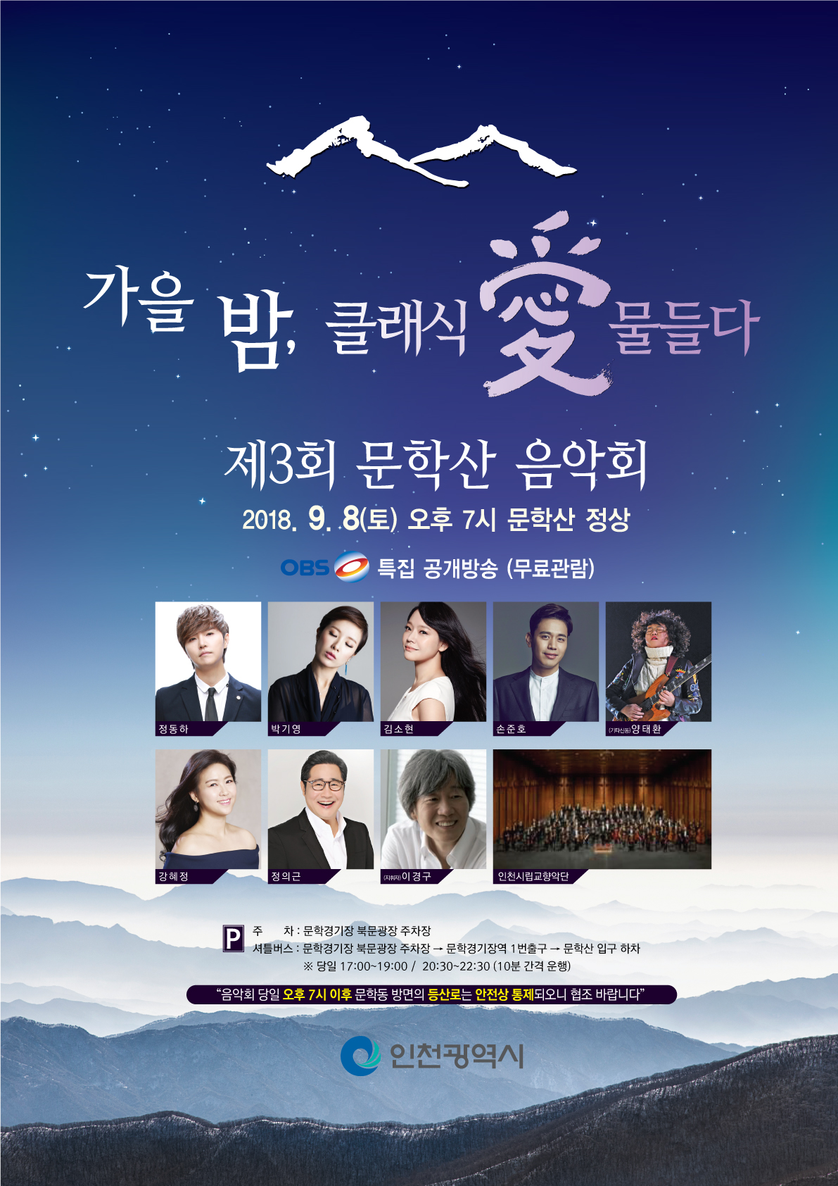 ‘일년에 단 한 번’ 문학산 정상에서 야경을 배경으로 『문학산 음악회』를 다음과 같이 개최하오니 시민 여러분의 많은 참석 부탁드립니다.