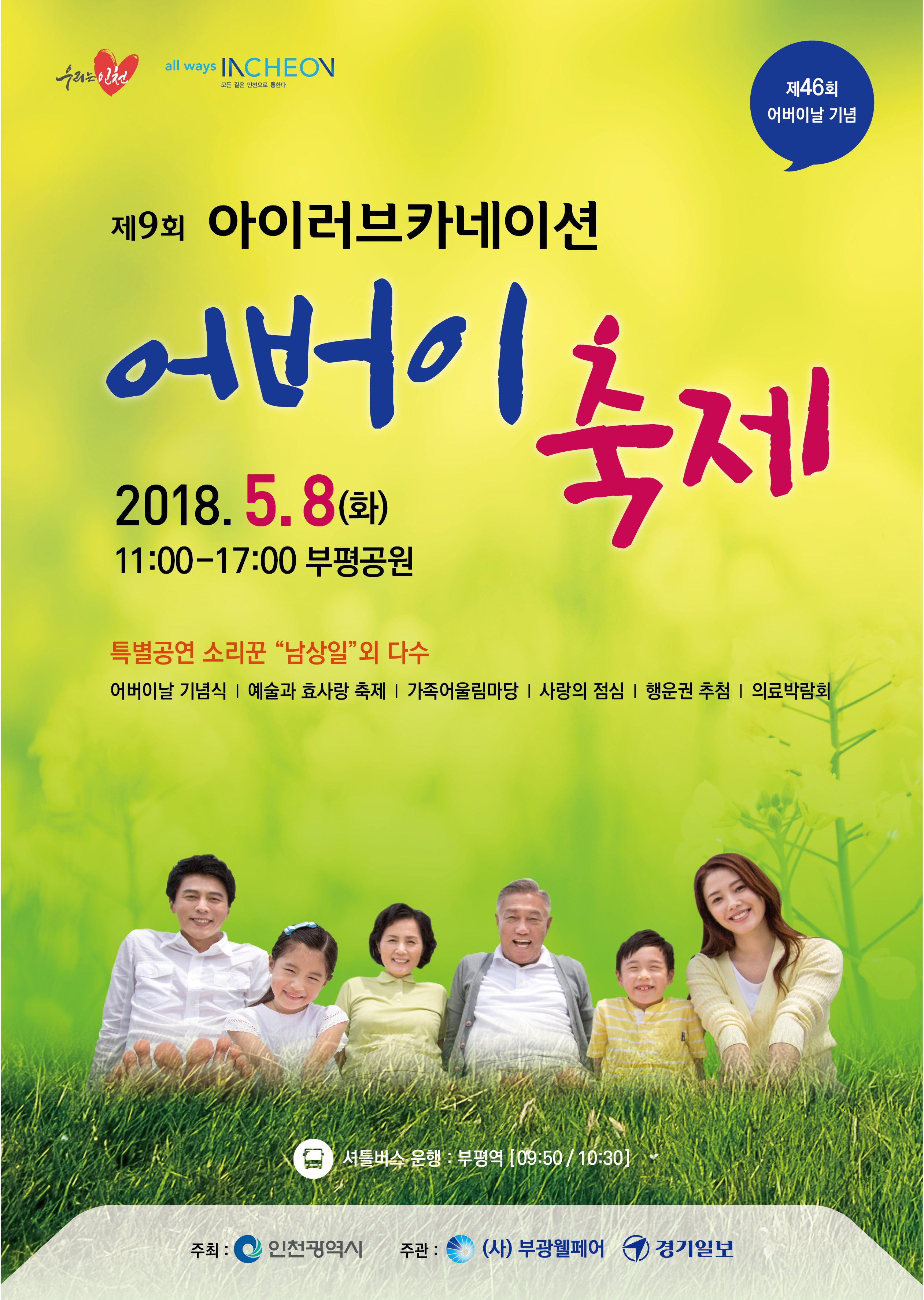 2018년 제46회 어버이날 기념 제9회 아이러브카네이션 어버이축제에 시민 여러분을 초청합니다. 가족과 함께 오셔서 다양한 행사와 공연에 참여하시고 가족의 의미를 되새기는 즐거운 시간 보내시기 바랍니다.