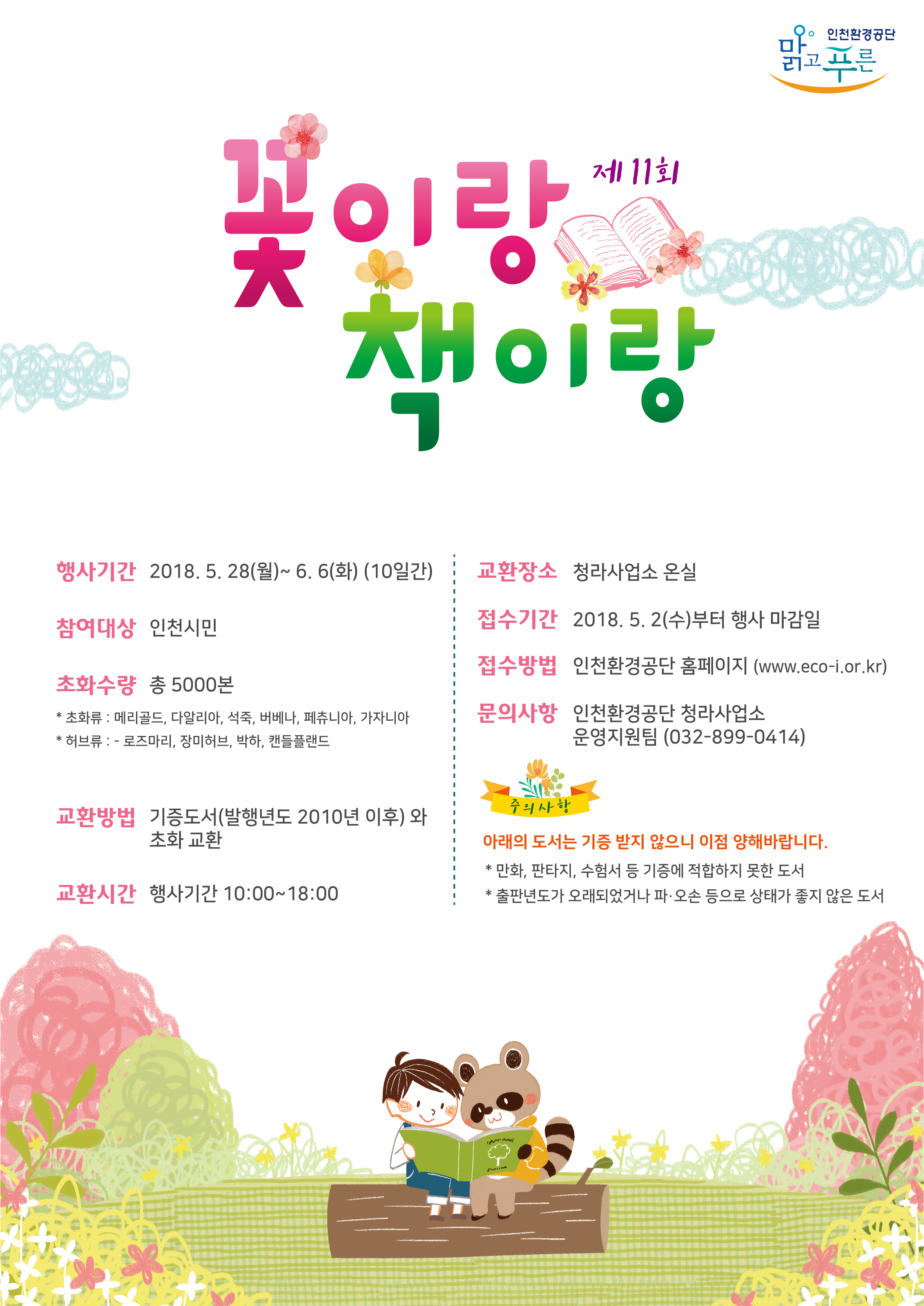 인천환경공단 청라사업소에서는 기후변화로 인한 환경문제의 심각성을 널리 알려 환경보전 의지를 확산시키고 도서 기증 동참을 위하여 집에서 보지 않는 헌책을 생활폐기물 소각여열을 이용하여 생산된 초화로 교환하는「제11회 꽃이랑...책이랑...」행사를 개최 하오니 많은 참여 부탁드립니다.