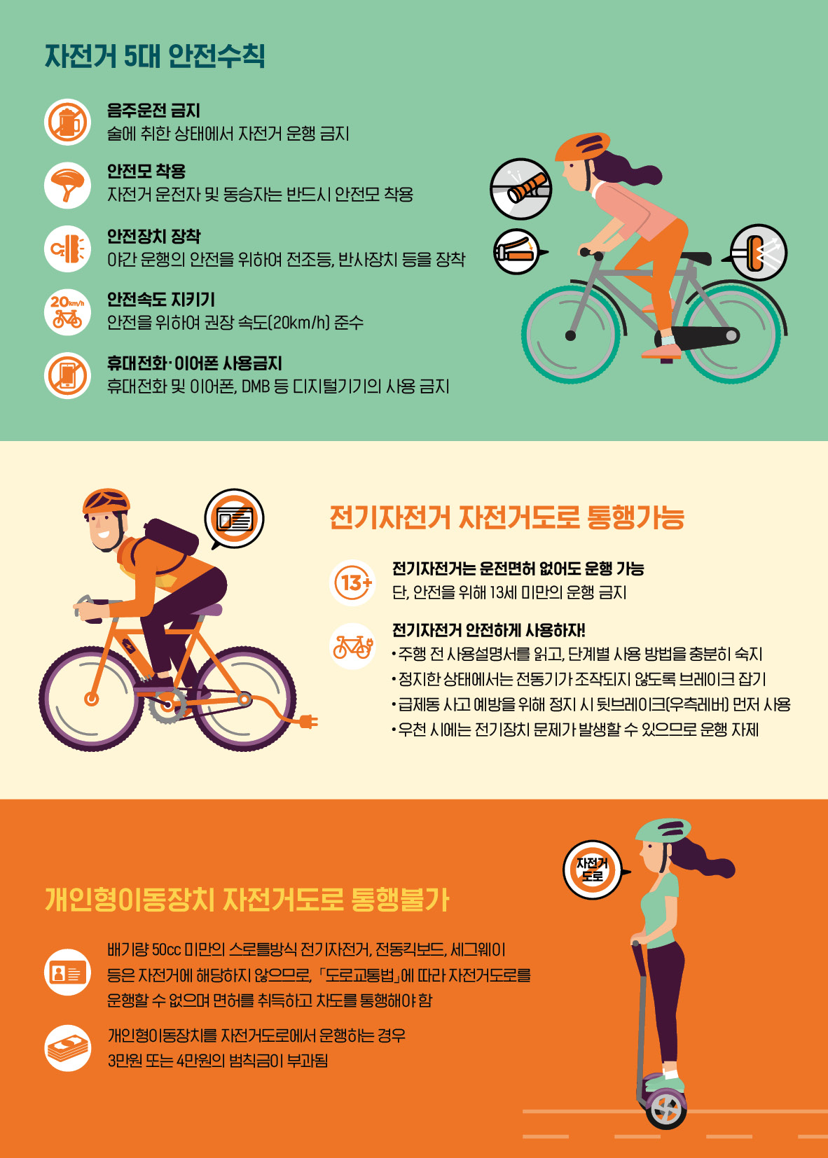 - 자전거도로 및 「도로법」에 따른 도로를 운전할 때에는 자전거 운전자 및 동승자는 반드시 안전모를 착용해야 함(제50조 제4항)