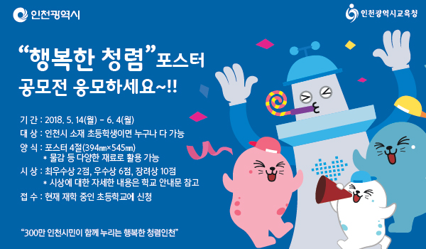 시민이 행복한 청렴한 인천 실현을 위하여 인천광역시청와 인천광역시교육청이 공동 주관으로 "행복한 청렴 인천" 포스터 공모전을 실시하오니 많은 관심과 참여 부탁드립니다.