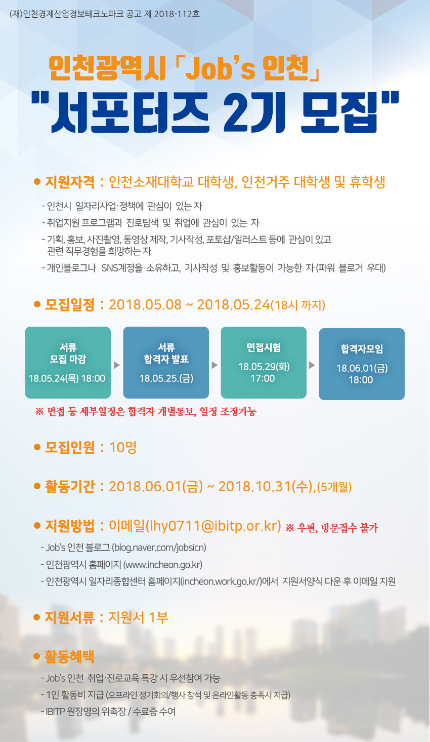 '잡스(Job's) 인천' 서포터즈로 활동할 대학생(휴학생 포함)을 모집합니다. 공공일자리정책과 시민간의 현장성 높은 소통의 공간이 될 '잡스(Job's) 인천'의 서포터즈로 활동할 수 있는 대학생들의 많은 참여 바랍니다.