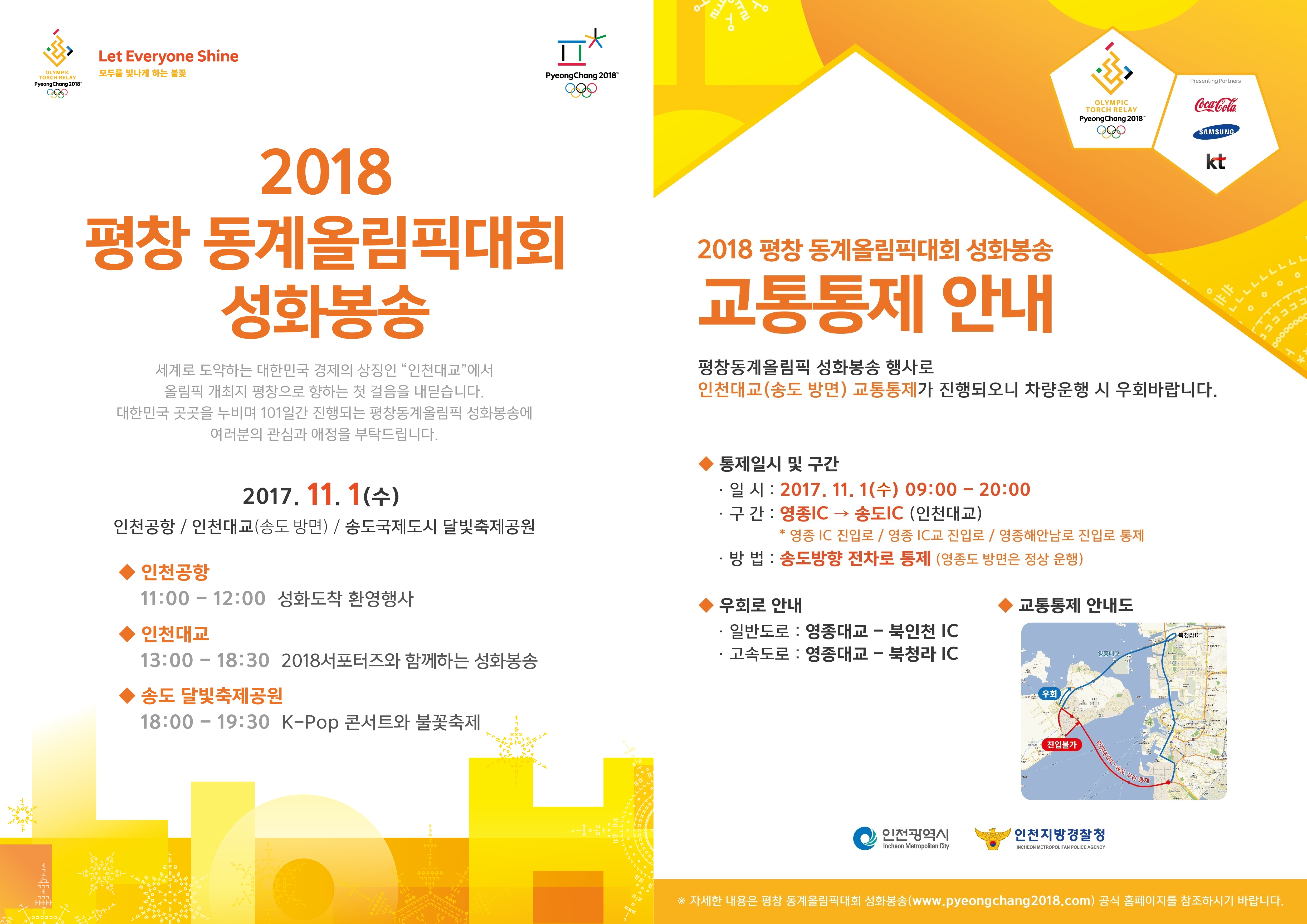 2018. 2월 평창에서 개최되는 동계올림픽 성화봉송행사가 2017년 11월1일과 2018. 1월10일~1월 12일까지 인천에서 각각 진행됩니다.