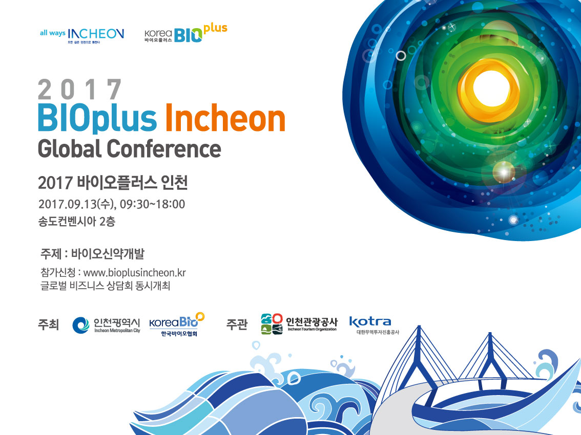 9.13(수) 송도컨벤시아 2층에서 열리는 "2017 바이오플러스 인천" 글로벌 컨퍼런스에 많은 관심과 참여 부탁드립니다.