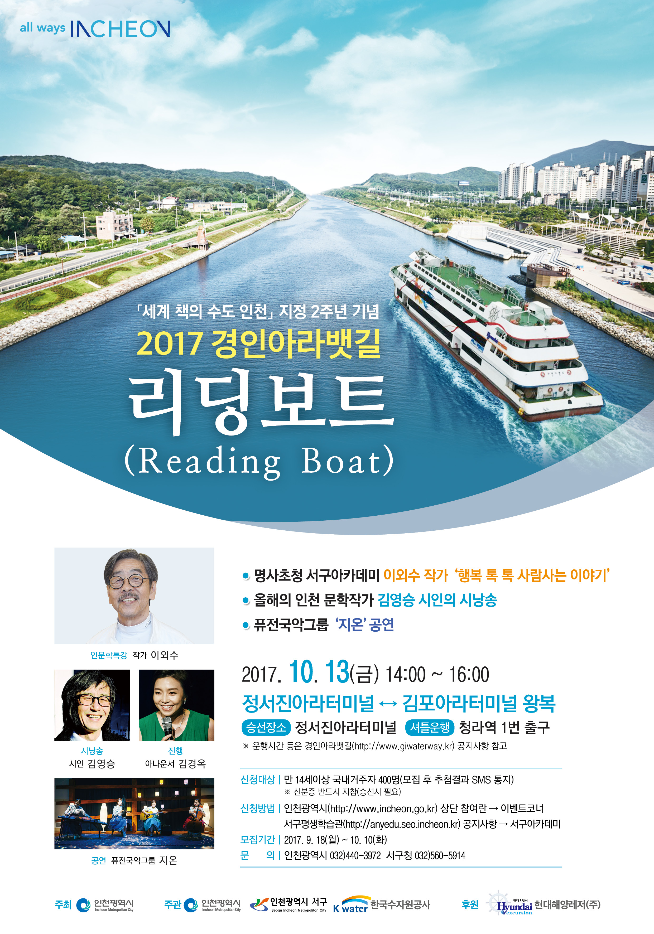 유네스코『세계 책의 수도』지정 2주년 행사로 2017년 제3회 경인아라뱃길 리딩보트(Reading Boat)가 2017년 10월 13일(금) 개최 됩니다. 올해는 신간출간 후 활발히 활동 중인 이외수 작가를 초청하여 “행복 톡! 톡!(Talk! Talk!) 사람사는 이야기“ 라는 주제로 인문학특강을 진행하며 올해의 인천문학작가 ‘김영승 시인’과의 시낭송, 국악퓨전그룹 ‘지온’의 공연으로 다채롭게 구성 될 예정이오니 많은 관심과 신청 부탁드립니다.