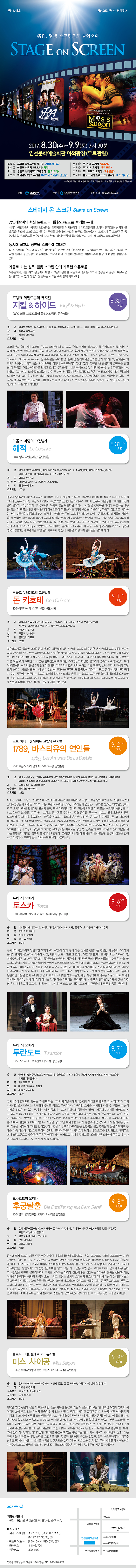 2013년 처음 기획되어 해마다 시민들의 뜨거운 호응을 얻고 있는 인천문화예술회관의 자체기획 프로그램인 “스테이지 온 스크린”은 세계 공연예술계의 화두인 ‘스크린으로 즐기는 공연’이라는 컨셉으로 세계 최정상 공연단체의 오페라, 발레, 뮤지컬 공연실황을 무료로 상영하는 프로그램입니다. 2017년에는 더욱 강력한 프로그램으로 준비되어 상영예정중이오니, 많은 관람 부탁드립니다.