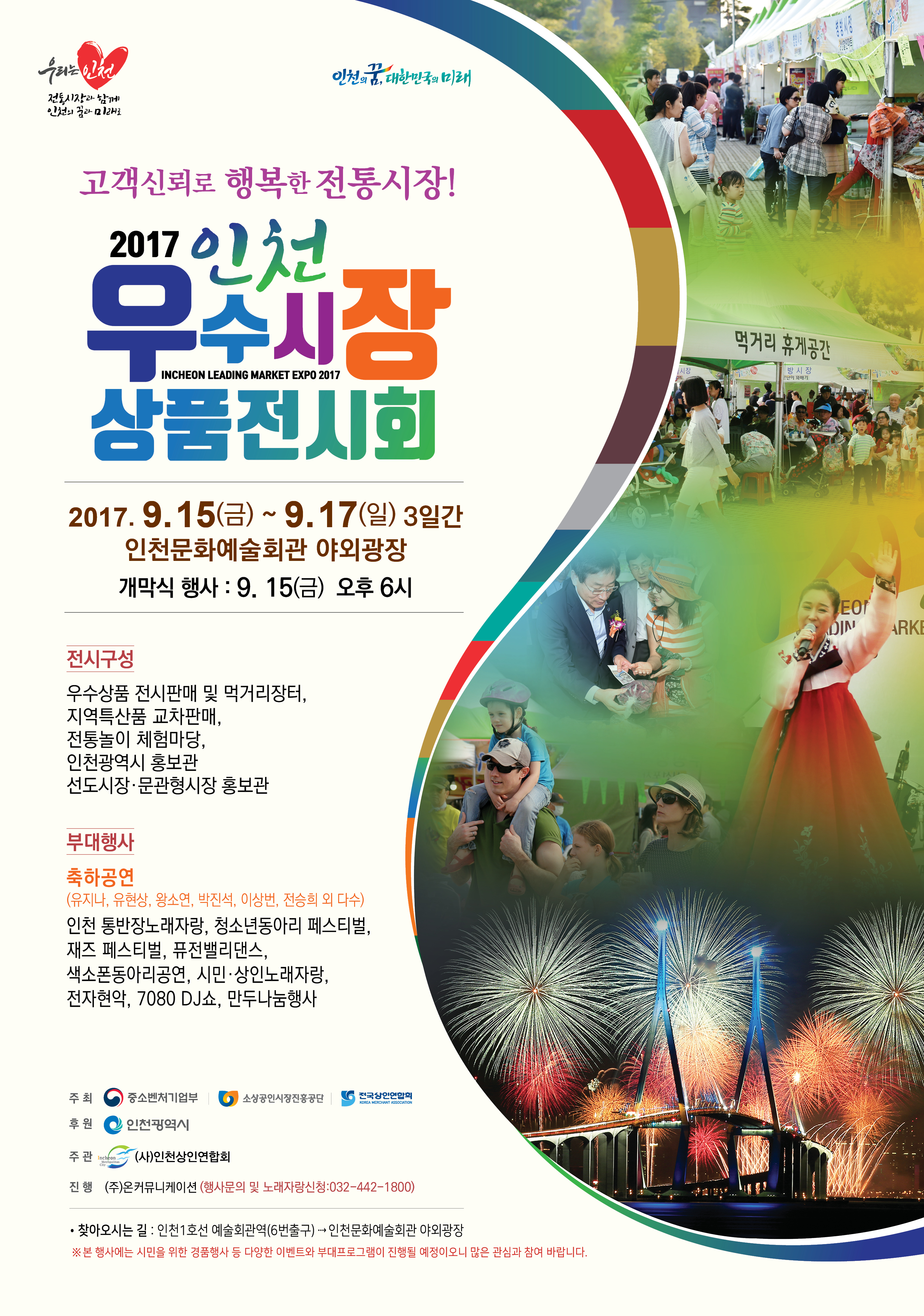 전통시장 활성화를 위한 '2017년 인천우수시장 상품전시회'를 개최하오니 많은관심과 참여 부탁드립니다.
