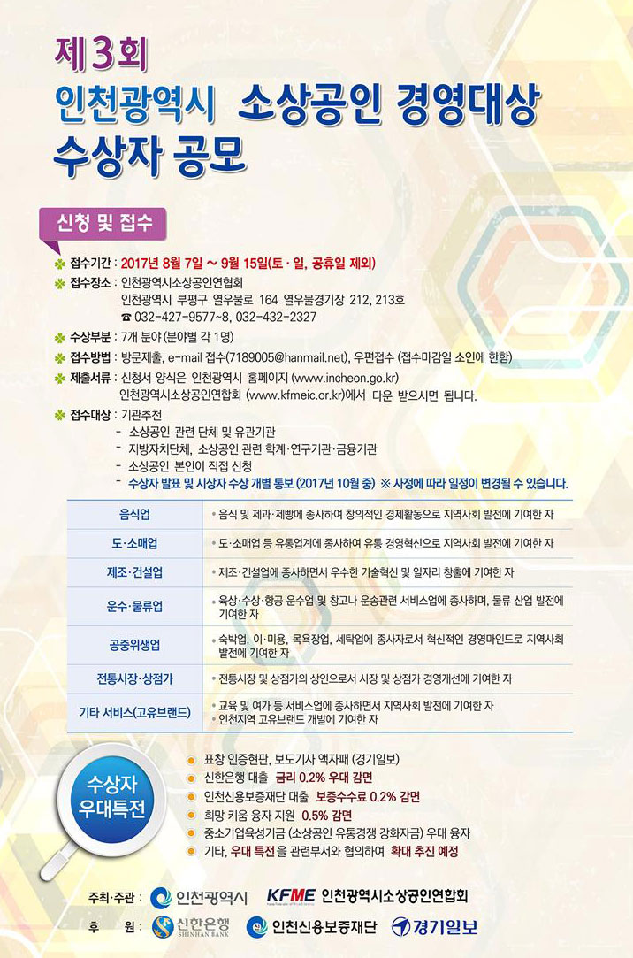 제3회 인천 소상공인 경영대상 수상자를 공모합니다.