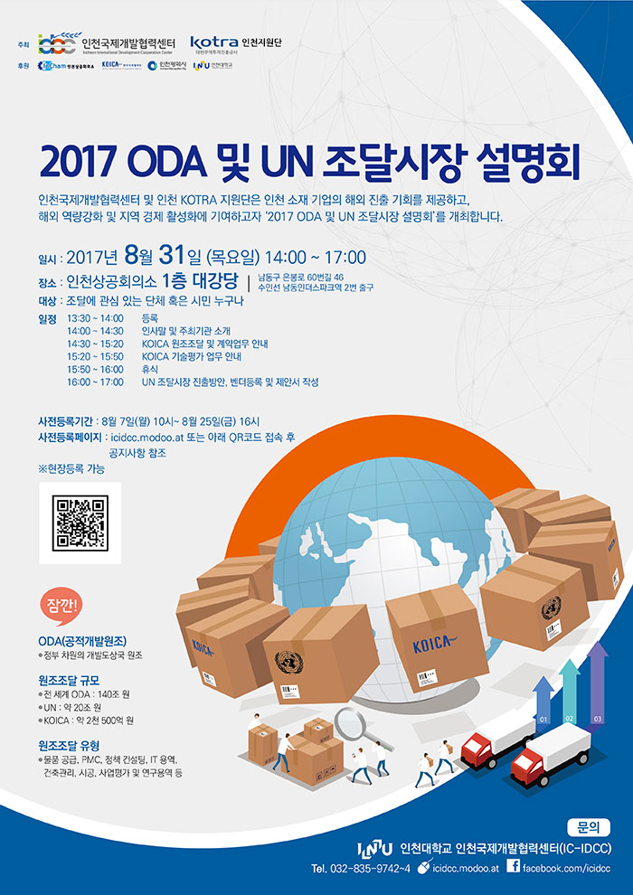 인천국제개발협력센터 및 인천 KOREA 지원단은 인천 소재 기업의 해외 진출 기회를 제공하고, 해외 역량강화 및 지역 경제 활성화에 기여하고자 '2017 ODA 및 UN 조달시장 설명회'를 개최합니다.