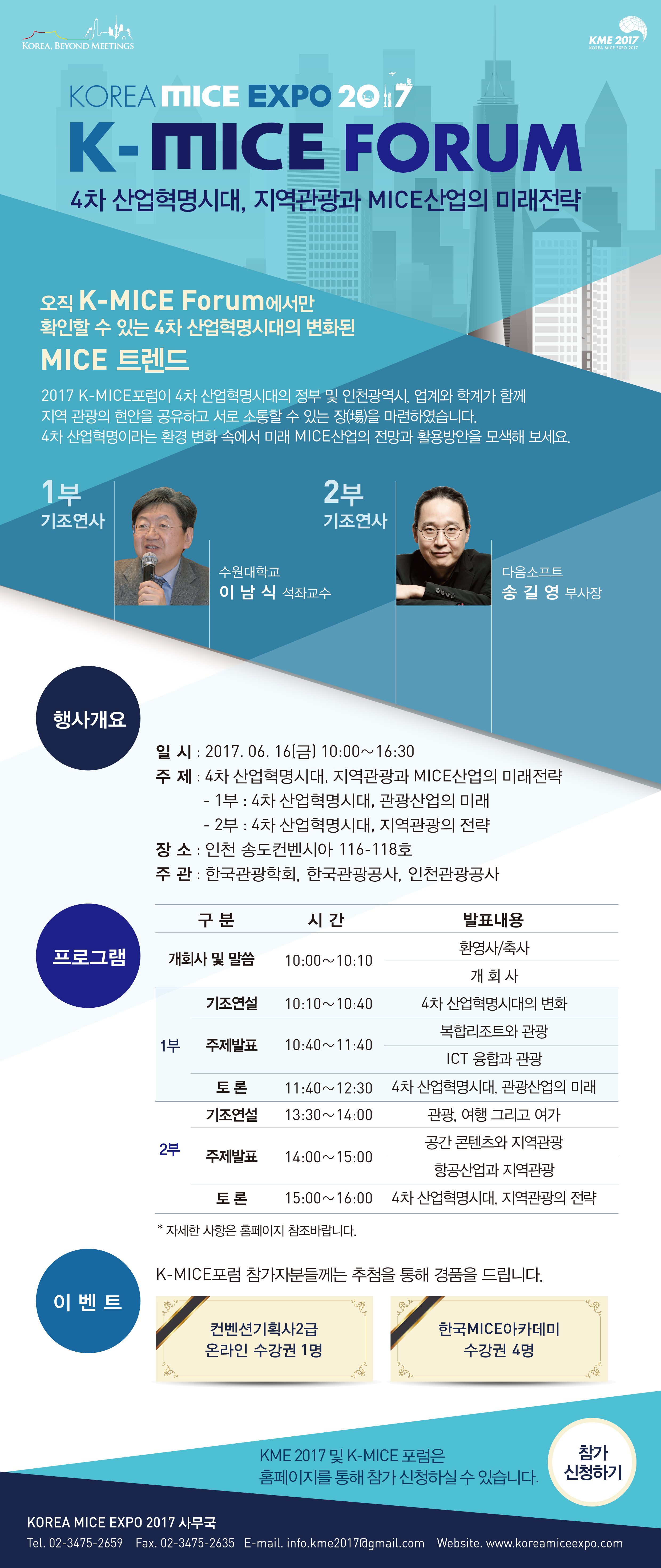 인천시가 주최하는 『코리아 마이스 엑스포(KME) 2017』 행사와 연계하여 개최하오니 많은 관심과 참여 부탁드립니다.