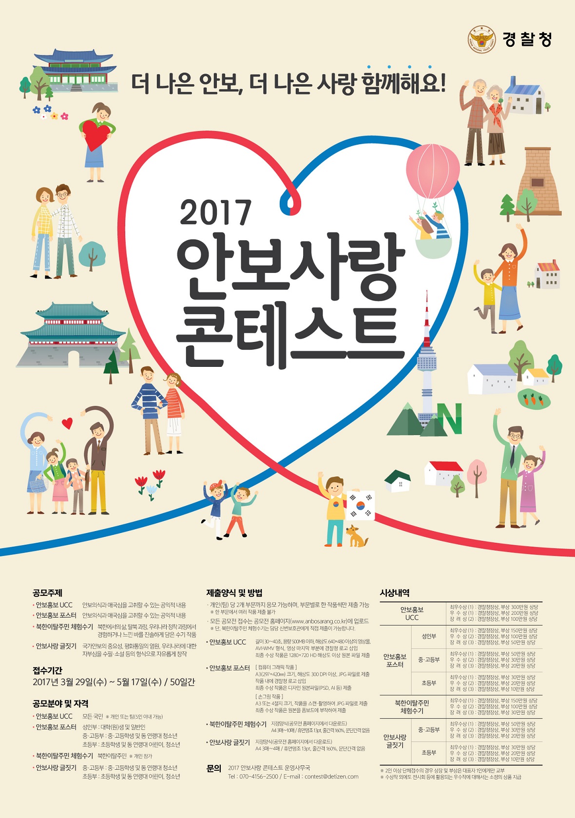 국가안보에 대한 생각을 다양한 방법으로 표현하는 공모전을 개최함으로써 국가안보의 중요성에 대한 국민적 공감대를 형성하고, 국민의 시각에서 제작되어 쉽게 공감할 수 있으면서 참신하고 수준 높은 홍보자료를 확보하고자 하는 『2017 안보사랑 콘테스트』를 개최하오니 관심있는 분들의 많은 참여 부탁드립니다.
