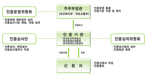 - 보건복지부와 국토교통부가 공동부령으로 운영하고, 공신력 있는 기관을 인증기관으로 지정하여 인증 적합 및 수준 여부를 평가하는 제도임