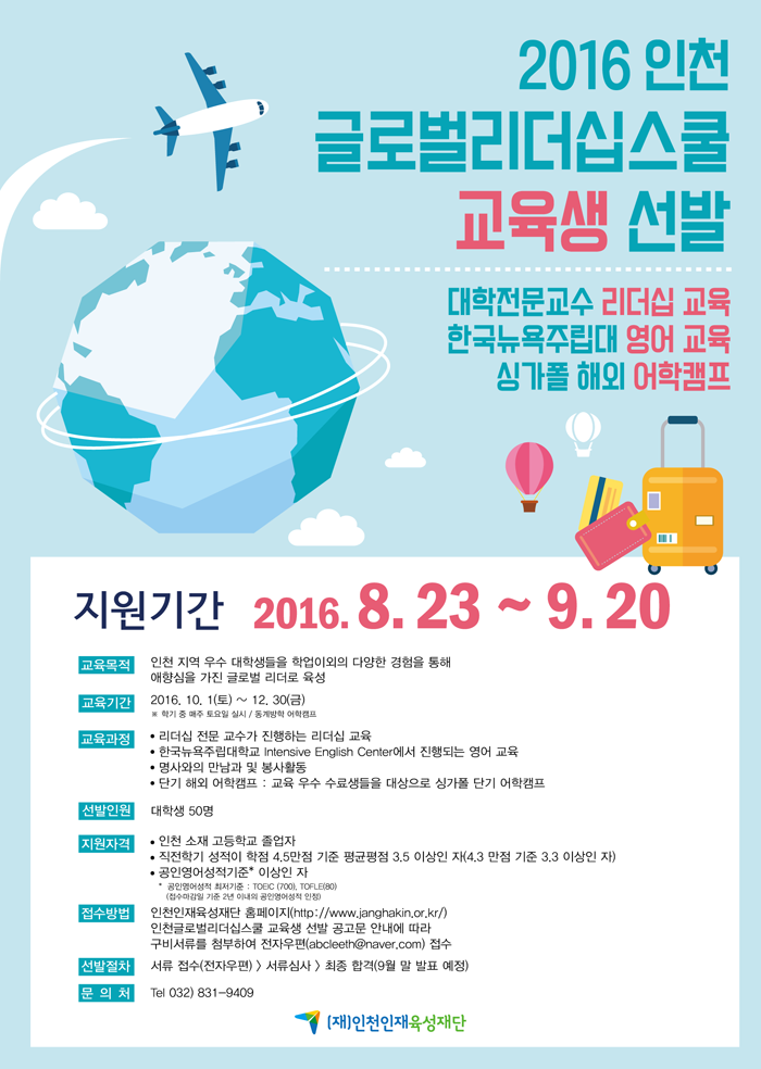 우수 인재를 발굴 육성하고 장학․평생교육사업을 추진하기 위하여 우리시에서 설립한 재단법인 인천인재육성재단에서 우수 대학생들이 글로벌 리더로서의 자질을 갖출 수 있도록 『인천글로벌리더십스쿨』을 운영하오니 많은 관심 부탁드립니다.