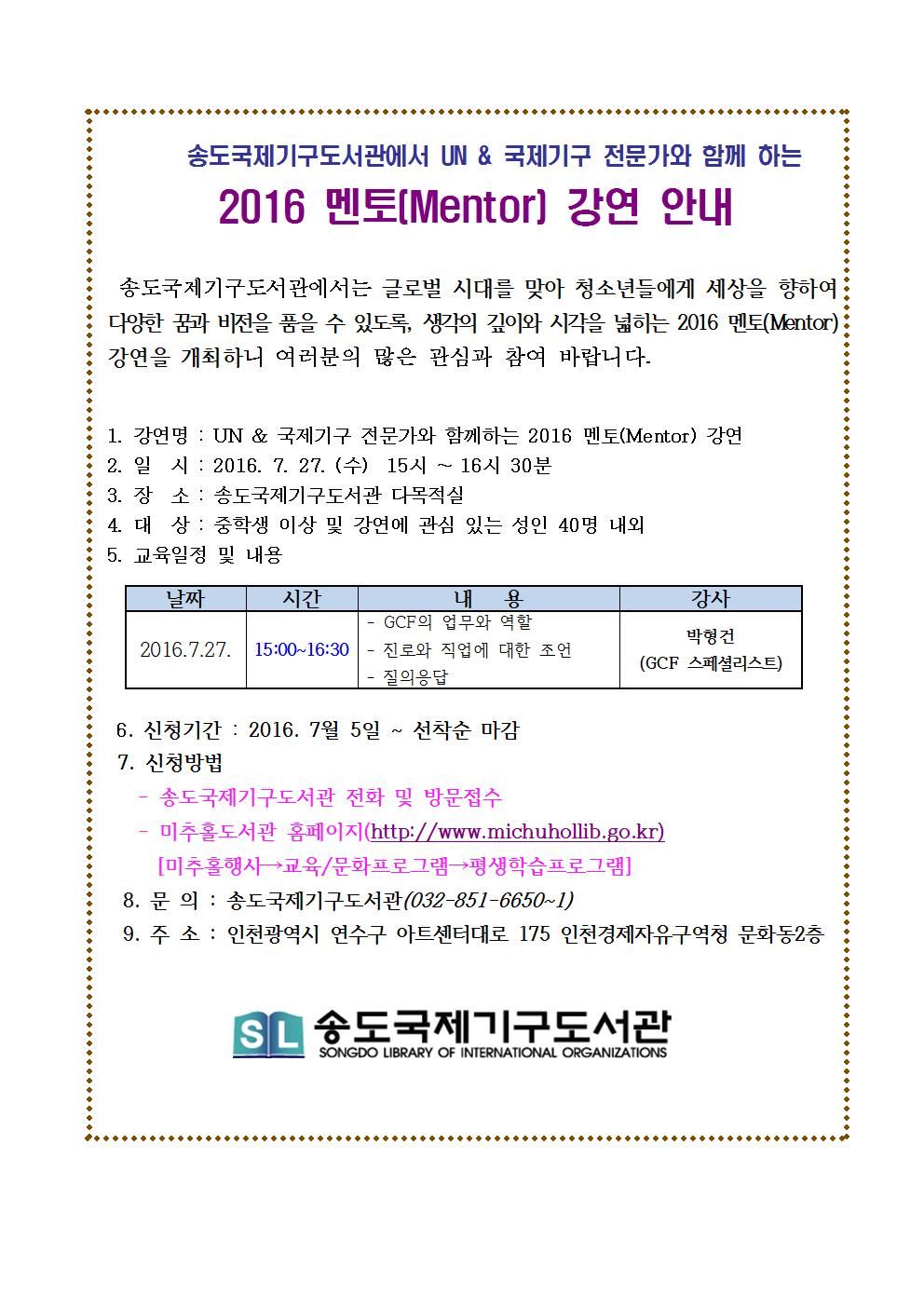 송도국제기구도서관에서는 글로벌 시대를 맞아 청소년들에게 세상을 향하여 다양한 꿈과 비전을 품을 수 있도록, 생각의 깊이와 시각을 넓히는 2016 멘토(Mentor) 강연을 개최하니 여러분의 많은 관심과 참여 바랍니다.