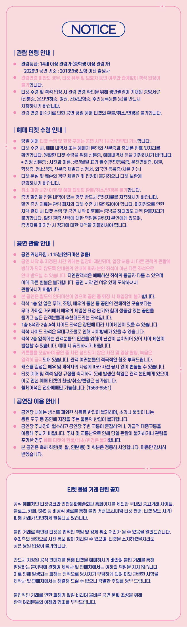 ※14세 이상 관람가(중학생이상 관람 가능)로, 입장 연령 미만은 티켓 소지/보호자 동반 여부와 관계없이 객석입장이 불가합니다.(내외국 학교 재학 및 타 공연 관람 여부와 관계 없이 2026년 공연 기준-2013년생 12월 31일 이전 출생자 관람 가능)