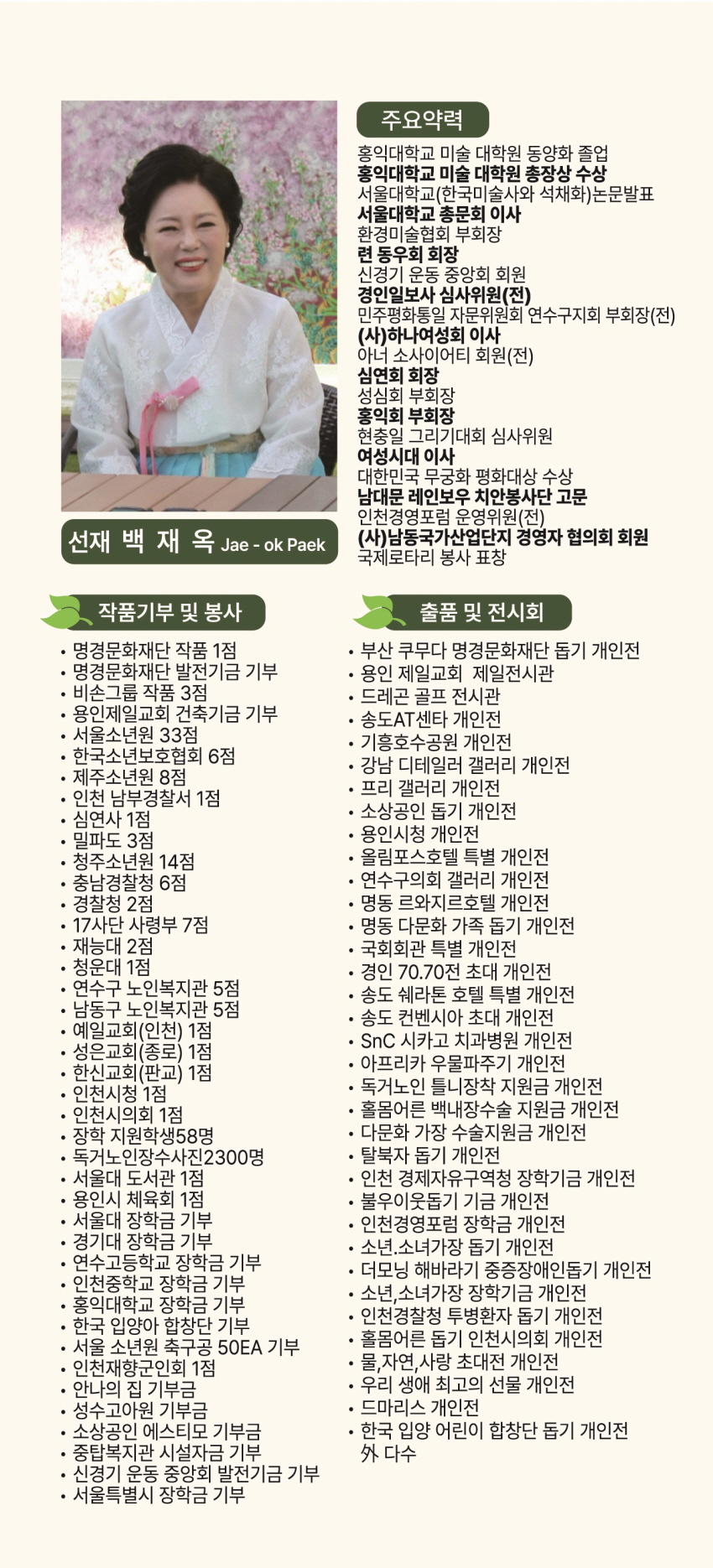 사단법인 장아 인재육성장학회가 주관하는 선재 백재옥 화백 특별초대전 “돌 위에 꽃 피우다”가 오는 3월 27일부터 4월 2일까지 인천 문화예술회관에서 개최된다.