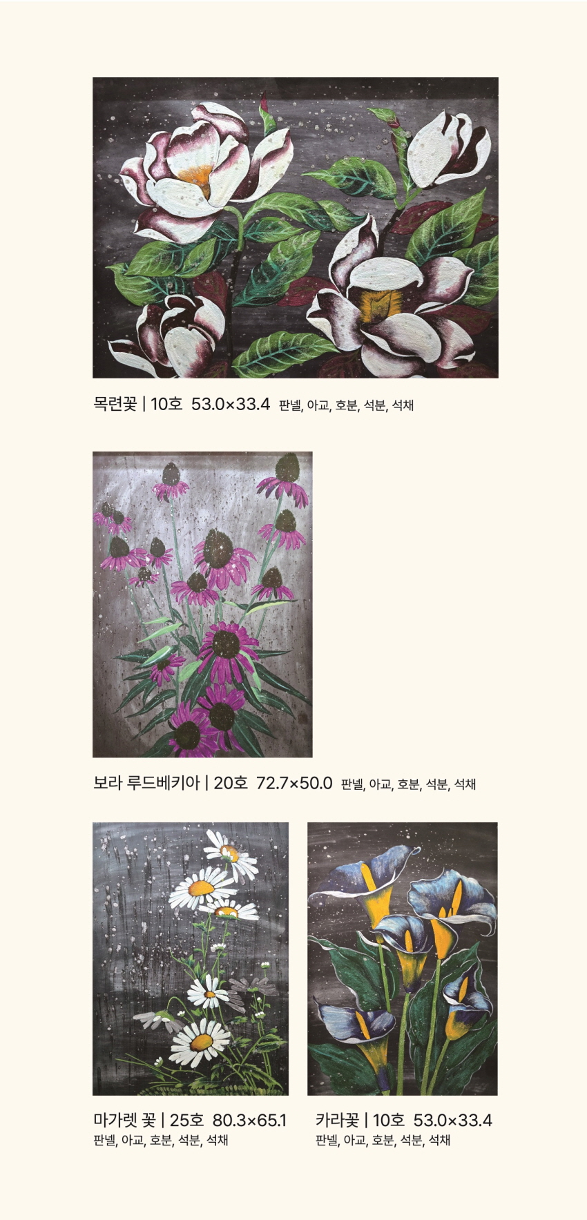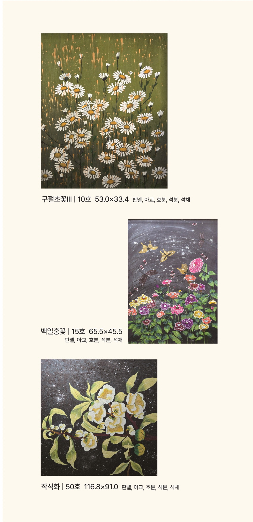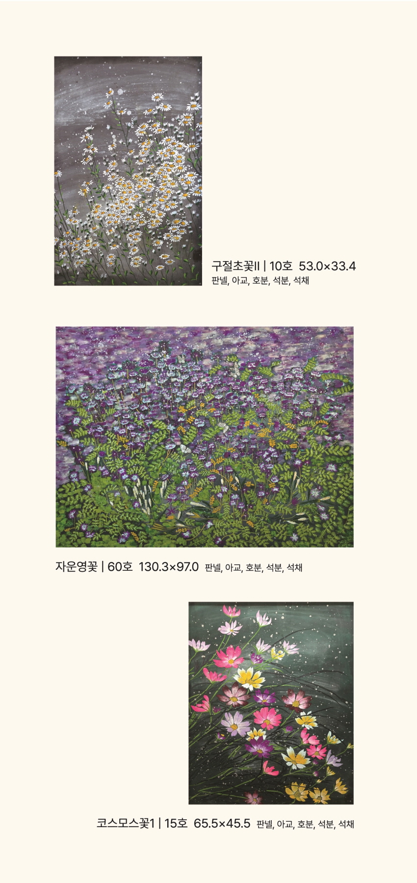 선재 백재옥 화백은 억겁의 시간을 견딘 천연석을 주재료로 삼아 자연의 강렬한 생명력과 변치 않는 사랑의 가치를 탐구해 온 작가이다. 그의 작업은 단순히 꽃을 재현하는 것에 머물지 않고, 돌가루(석분)라는 물성을 통해 생명의 정수를 포착하여 시각화한다. 작가는 엄혹한 겨울을 뚫고 피어난 들꽃을 ‘생명의 아포리즘’으로 정의하며, 인위적이지 않은 날 것 그대로의 생명력을 간결하면서도 강렬한 석채화로 구현한다.