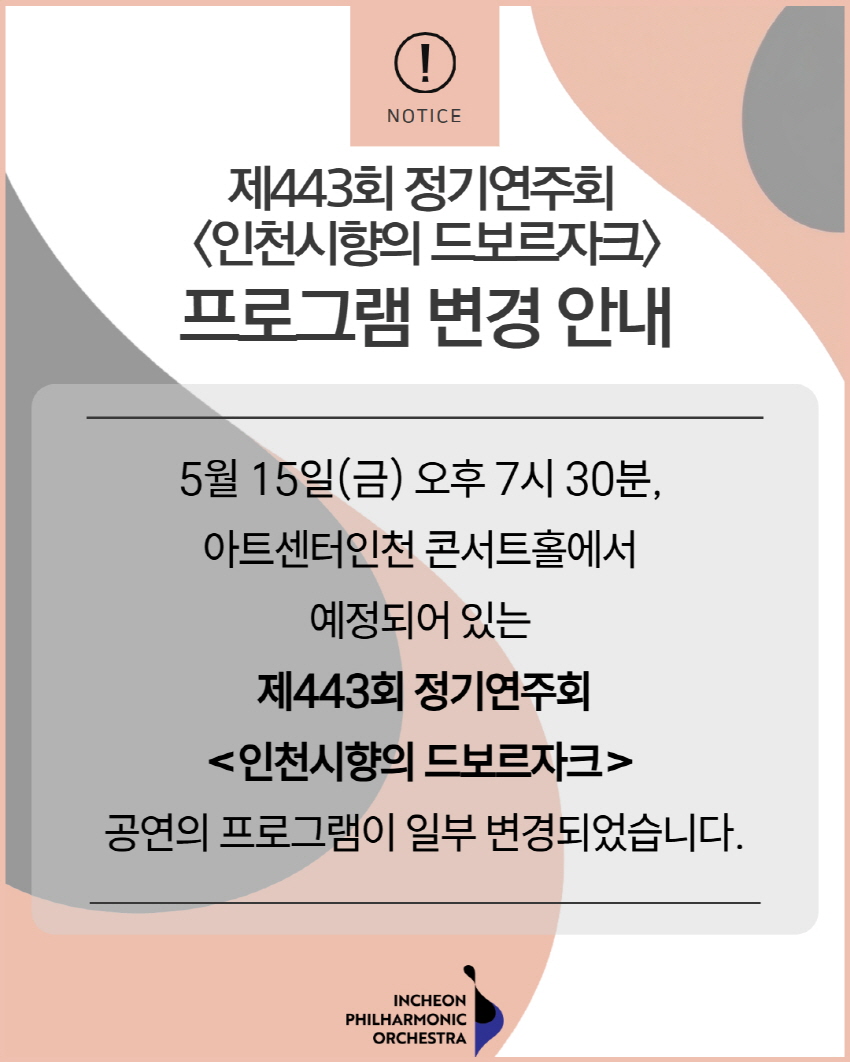 2026년 5월 15일(금) 오후 7시30분, 아트센터인천 콘서트홀에서 예정된 인천시립교향악단 제443회 정기연주회 <인천시향의 드보르자크> 관련하여 아래와 같이 일부 프로그램이 변경되었음을 알려드립니다.